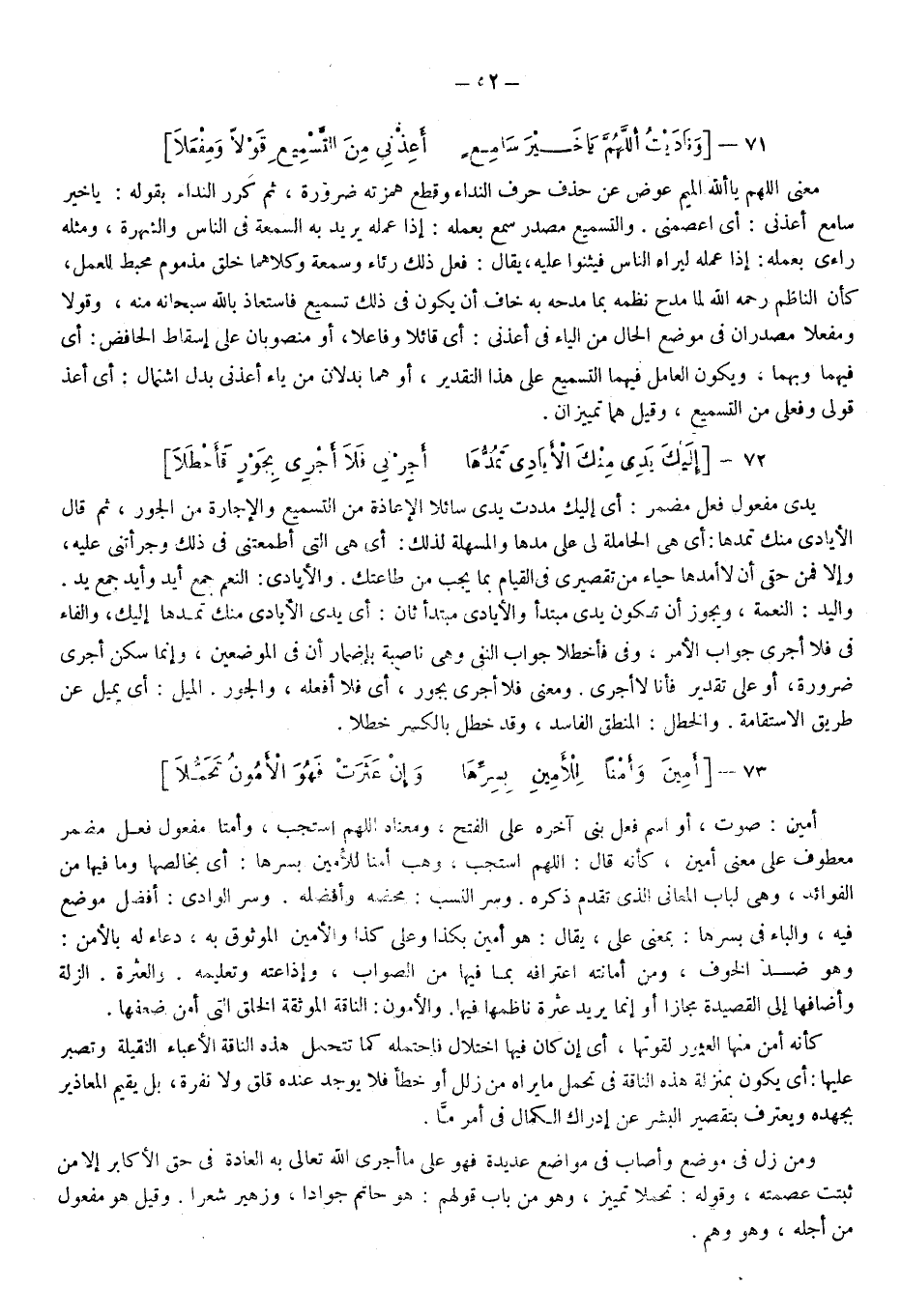 أمين: صوت أو اسم فعل بني آخره على الفتح ومعناه اللهم استجب وأمنا مفعول فعل مضمر معطوف على معنى أمين كأنه قال: اللهم استجب وهب أمنا للأمين بسرها أي بخالصها وما فيها من الفوائد وهي لباب المعاني الذي تقدم ذكره، وسر النسب محضه وأفضله، وسر الوادي: أفضل موضع فيه والباء في بسرها بمعنى على يقال هو أمين بكذا وعلى كذا والأمين الموثوق به دعاء له بالأمن وهو ضد الخوف ومن أمانته اعترافه بما فيها من الصواب وإذاعته وتعليمه، والعثرة، الزلة وأضافها إلى القصيدة مجازا أو إنما يريد عثرة ناظمها فيها، والأمون الناقة الموثقة الخلق التي أمن ضعفها.