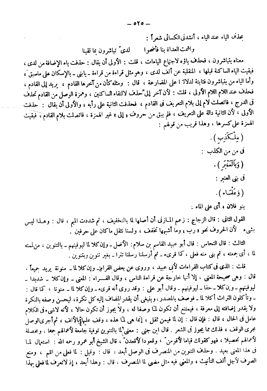 معناه يتباشرون، فحذف ياؤه؛ لاجتماع الياءات قلت: الأولى أن يقال: حذفت ياء الإضافة من لدى، فبقيت الياء الساكنة قبلها المنقلبة عن ألف لدى، وهو مثل قراءة: "يا بني" بالإسكان على ما سبق، أما الياء من يتباشرون فثابتة؛ لدلالتها على المضارعة قال ومثله كأن من آخرها القادم يريد إلى القادم، فحذف عند اللام اللام الأولى، قلت: لأن آخر "إلى" حذف لالتقاء الساكنين، وهمزة الوصل من القادم تحذف في الدرج، فاتصلت لام "إلى" بلام التعريف في القادم، فحذفت الثانية على رأيه، والأولى أن يقال: حذفت الأولى؛ لأن الثانية دالة على التعريف، فلم يبق من حروف "إلى" غير الهمزة، فاتصلت بلام القادم، فبقيت الهمزة على كسرها وهذا قريب من قولهم: "ملكذب".