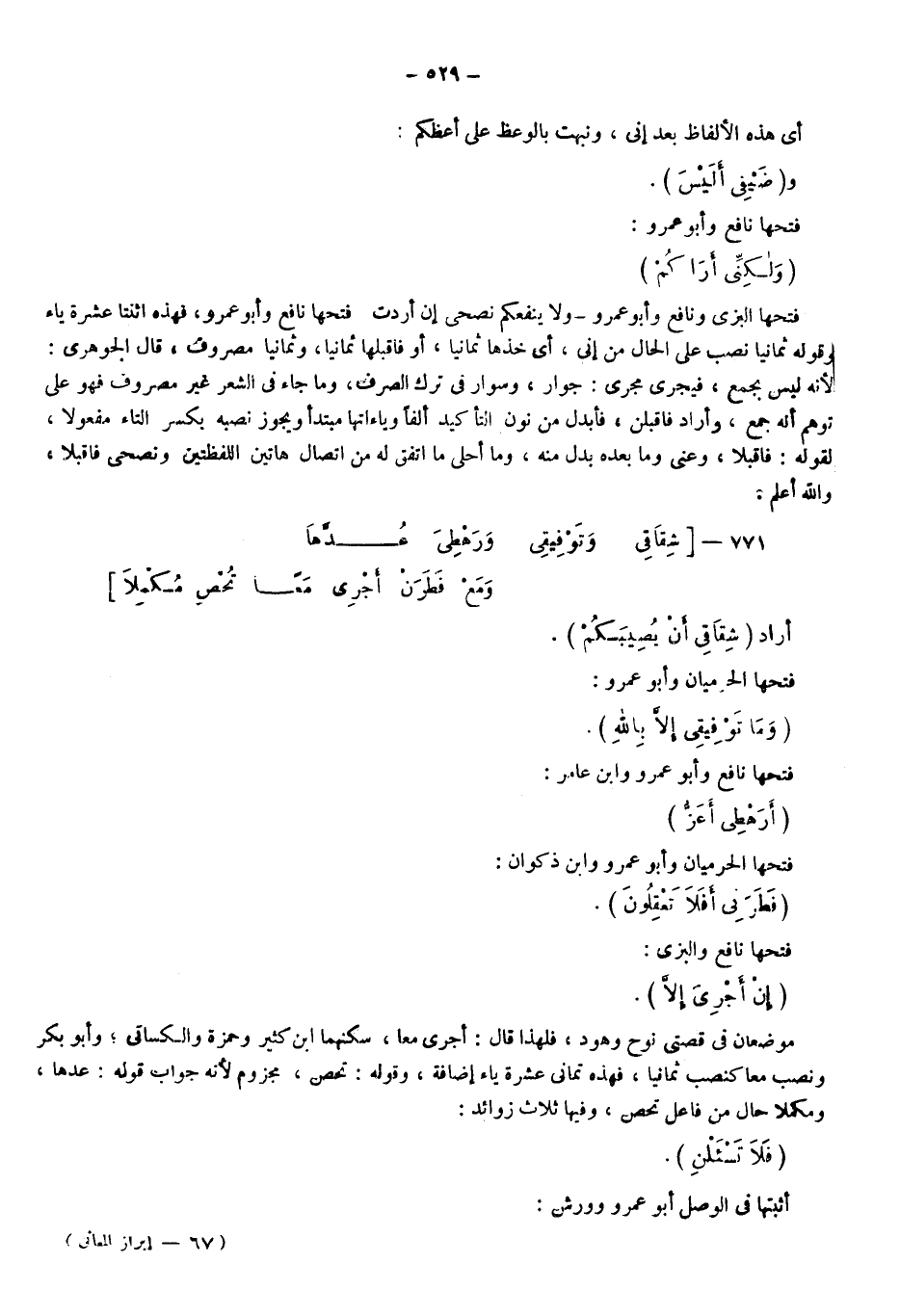 "ولا ينفعكم نصحيَ إن أردت"، فتحها نافع وأبو عمرو، فهذه اثنتا عشرة ياء، وقوله: ثمانيًا نصب على الحال من إني؛ أي: خذها ثمانيا أو فاقبلها ثمانيا، وثمانيا مصروف، قال الجوهري: لأنه ليس بجمع فيجري مجرى جوارٍ وسوارٍ في ترك الصرف، وما جاء في الشعر غير مصروف فهو على توهم أنه جمع، وأراد: "فاقبلن"، فأبدل من نون التأكيد ألفا وياءاتها مبتدأ، ويجوز نصبه بكسر التاء مفعولا لقوله: فاقبلا، وعنى وما بعده بدل منه وما أحلى ما اتفق له من اتصال هاتين اللفظتين ونصحيَ فاقبلا والله أعلم.