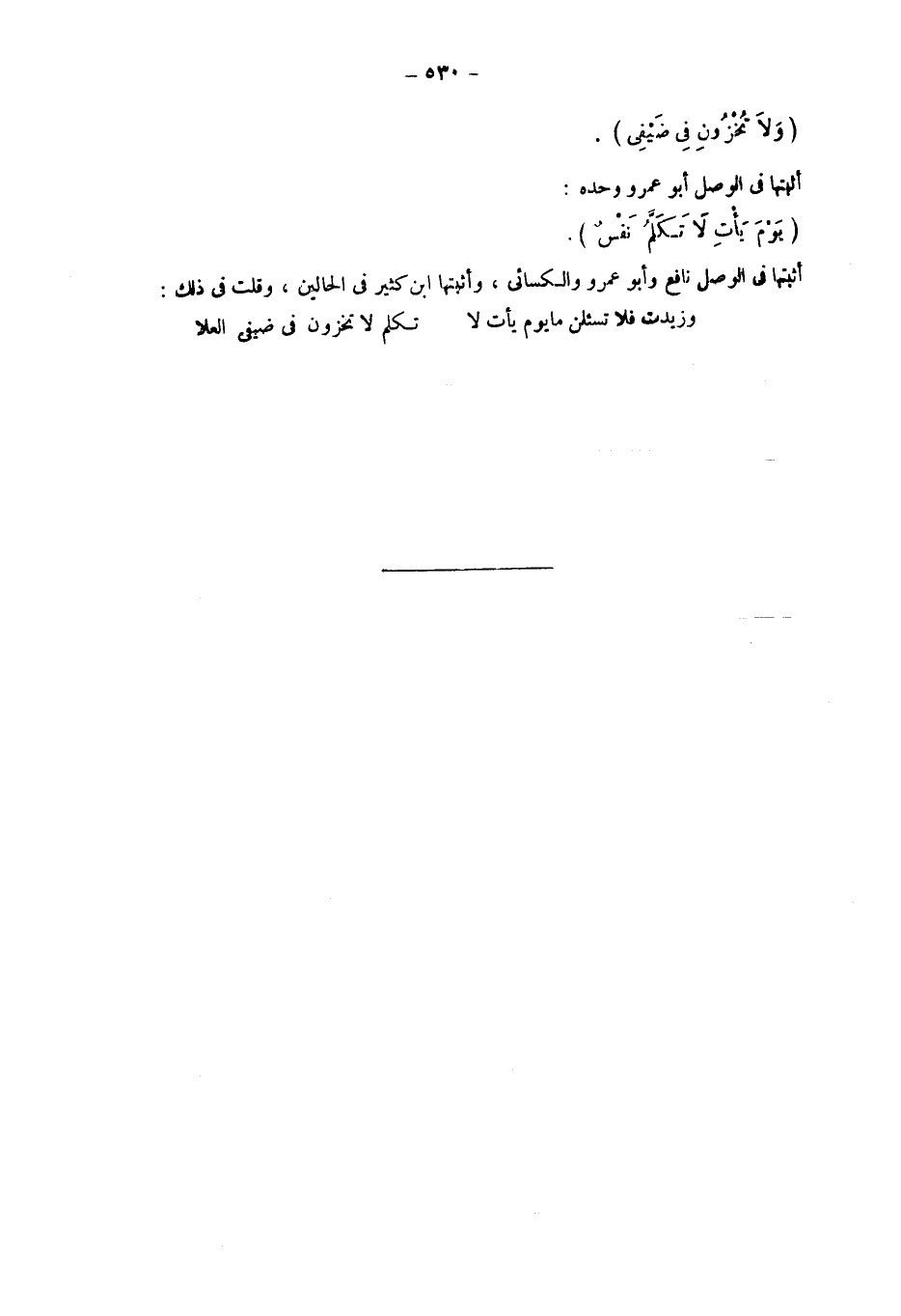 "يَوْمَ يَأْتِي لا تَكَلَّمُ نَفْسٌ"، أثبتها في الوصل نافع وأبو عمرو والكسائي، وأثبتها ابن كثير في الحالين. وقلت في ذلك: