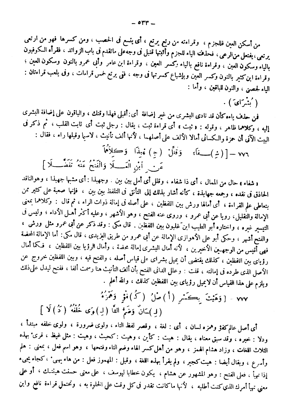 "شفاء" حال من الممال؛ أي: ذا شفاء، وقَلِّل؛ أي: أَمِلْ بين بين. وجهبذا:؛ أي: مشبها جهبذا وهو الناقد الحاذق في نقده وجمعه جهابذة كأنه أشار بذلك إلى التأنق في التلفظ بين بين فإنها صعبة على كثير ممن يتعاطى علم القراءة؛ أي: أمالها ورش بين اللفظين على أصله في إمالة ذوات الراء ثم قال: وكلاهما بمعنى الإمالة والتقليل رويا عن أبي عمرو، وروي عنه الفتح وهو الأشهر وعليه أكثر أهل الأداء وليس في التيسير غيره، واختاره أبو الطيب بن غلبون بين اللفظين. قال مكي: وقد ذكر عن أبي عمرو مثل ورش والفتح أشهر، وحكى أبو علي الأهوازي الإمالة عن أبي عمرو من طريق اليزيدي. قال مكي: أما الإمالة المحضة فهي قيس من الوجهين الأخيرين؛ لأنه أمال البشرى إمالة محضة وأمال "الرؤيا" بين اللفظين، فكما أمال "رؤياي" بين اللفظين كذلك يقتضي أن يميل "بشراي" على قياس أصله والفتح فيه وبين اللفظين خروج عن الأصل الذي طرده في إمالته. قلت: وعلل الداني الفتح بأن ألف التأنيث هنا رسمت ألفا ففتح؛ ليدل على ذلك، ويلزم على هذا القياس أن لا يميل رؤياي بين اللفظين كذلك والله أعلم.