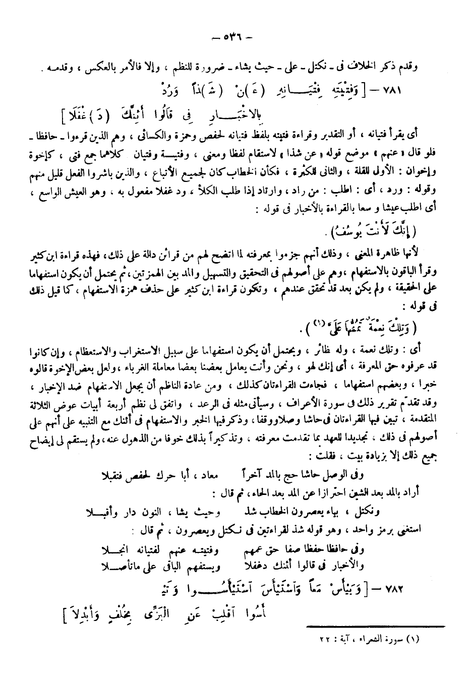 أي: وتلك نعمة وله نظائر، ويحتمل أن يكون استفهاما على سبيل الاستغراب والاستعظام وإن كانوا قد عرفوه حق المعرفة؛ أي: إنك لهو ونحن وأنت يعامل بعضنا بعضا معاملة الغرباء ولعل بعض الإخوة قالوه خبرا وبعضهم استفهاما، فجاءت القراءتان كذلك ومن عادة الناظم أن يجعل الاستفهام ضد الإخبار، وقد تقدم تقرير ذلك في سورة الأعراف وسيأتي مثله في الرعد، واتفق لي نظم أربعة أبيات عوض الثلاثة المتقدمة تبين فيها القراءتان في حاشا وصلا ووقفا، وذكر فيها الخبر والاستفهام في أئنك مع التنبيه على أنهم على أصولهم في ذلك تجديدًا للعهد بما تقدمت معرفته وتذكيرا بذلك خوفا من الذهول عنه، ولم يستقم لي إيضاح جميع ذلك إلا بزيادة بيت فقلت: