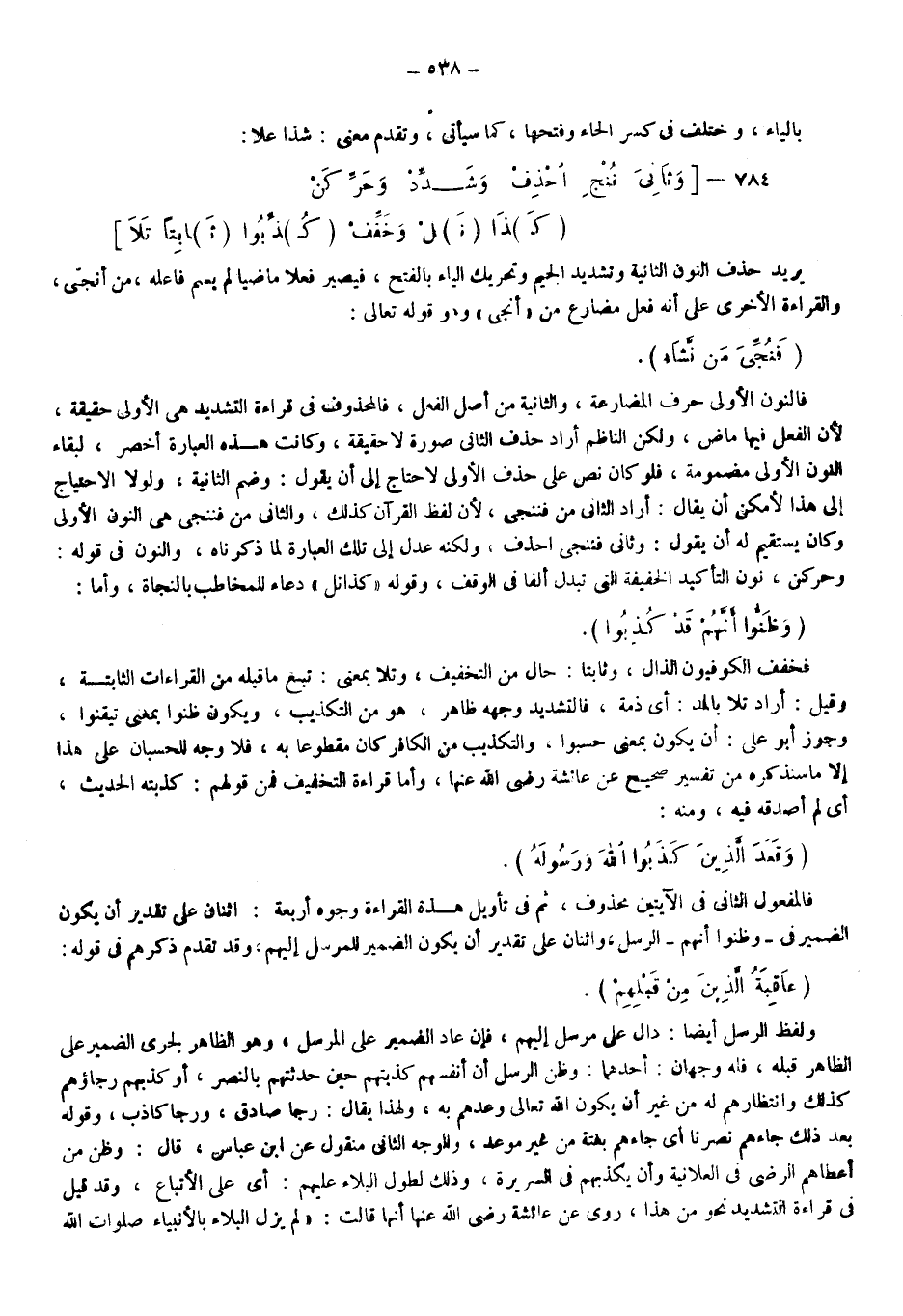 فخفف الكوفيون الذال وثابتا: حال من التخفيف، وتلا بمعنى: تبع ما قبله: من القراءات الثابتة وقيل: أراد تلا بالمد؛ أي: ذمة فالتشديد وجهه ظاهر هو من التكذيب ويكون ظنوا بمعنى تيقنوا وجوز أبو علي أن يكون بمعنى حسبوا، والتكذيب من الكافر كان مقطوعا به فلا وجه للحسبان على هذا إلا ما سنذكره من تفسير صحيح عن عائشة -رضي الله عنها- أما قراءة التخفيف فمن قولهم: كذبته الحديث؛ أي: لم أصدقه فيه، ومنه: {وَقَعَدَ الَّذِينَ كَذَبُوا اللَّهَ وَرَسُولَهُ} .