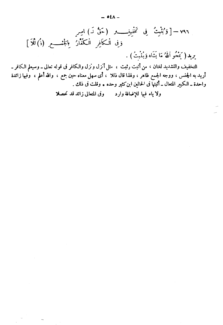 التخفيف والتشديد لغتان من أثبت وثبت مثل أنزل ونزل والكافر في قوله: تعالى: "سيعلم الكافر" أريد به الجنس ووجه الجمع ظاهر، ولهذا قال ذللا؛ أي: سهل معناه حين جمع والله أعلم، وفيها زائدة واحدة: "الْكَبِيرُ الْمُتَعَالِي" أثبتها في الحالين ابن كثير وحده، وقلت في ذلك: