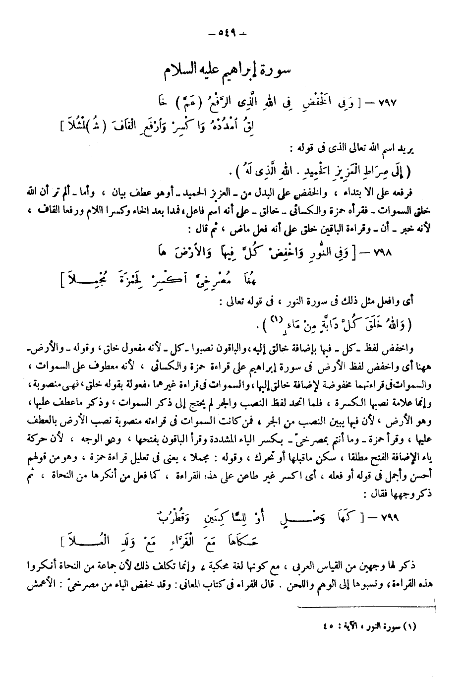 واخفض لفظ "كل" فيها بإضافة "خالق" إليه، والباقون نصبوا "كل"؛ لأنه مفعول خلق وقوله: "وَالْأَرْضِ" ههنا؛ أي: واخفض لفظ الأرض في سورة إبراهيم على قراءة حمزة والكسائي؛ لأنه معطوف على السموات والسموات في قراءتهما مخفوضة لإضافة خالق إليها والسموات في قراءة غيرهما مفعولة بقوله: خلق فهي منصوبة وإنما علامة نصبها الكسرة فلما اتحد لفظ النصب والجر لم يحتج إلى ذكر السموات، وذكر ما عطف عليها وهو الأرض؛ لأن فيها يبين النصب من الجر، فمن كانت السموات في قراءته منصوبة نصب الأرض بالعطف عليها، وقرأ حمزة: "وما أنتم بمصرخي" بكسر الياء المشددة وقرأ الباقون بفتحها وهو الوجه؛ لأن حركة ياء الإضافة الفتح مطلقا سكن ما قبلها أو تحرك وقوله: مجملا؛ يعني: في تعليل قراءة حمزة، وهو من قولهم: أحسن وأجمل في قوله أو فعله؛ أي: اكسر غير طاعن على هذه القراءة كما فعل من أنكرها من النحاة ثم ذكر وجهها فقال: