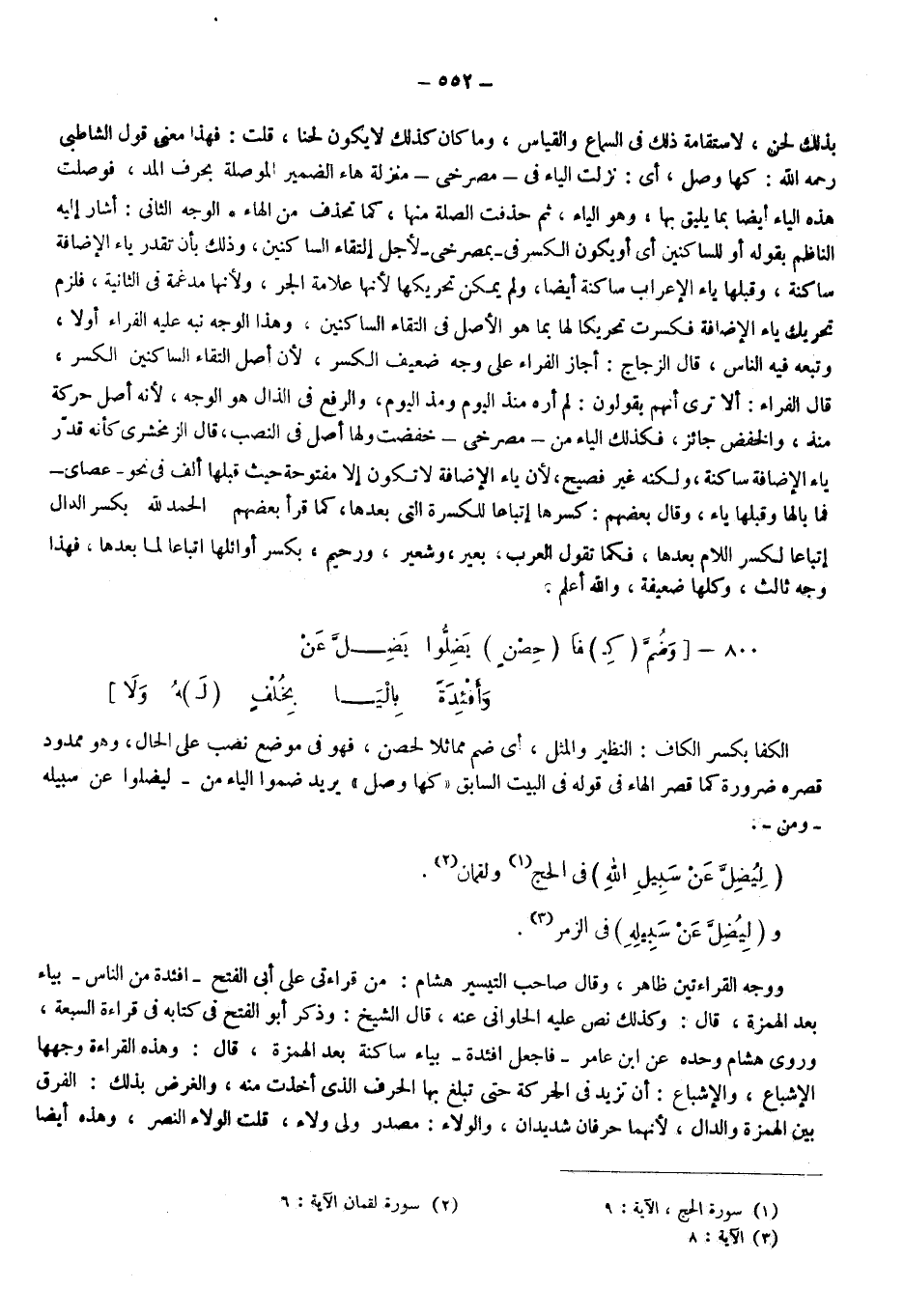الكفا بكسر الكاف: النظير والمثل؛ أي: ضم مماثلا لحصن فهو في موضع نصب على الحال وهو ممدود قصره ضرورة كما قصر الهاء في قوله في البيت السابق: كـ "ها" وصل يريد ضموا الياء من: {لِيُضِلُّوا عَنْ سَبِيلِهِ} من: {لِيُضِلَّ عَنْ سَبِيلِ اللَّهِ} في الحج1 ولقمان2، و {لِيُضِلَّ عَنْ سَبِيلِهِ} في الزمر3، ووجه القراءتين ظاهر، وقال صاحب التيسير هشام: من قراءتي علي أبي الفتح: "أَفْئِدَةً مِنَ النَّاسِ" بياء بعد الهمزة قال: وكذلك نص عليه الحلواني عنه، قال الشيخ: وذكر أبو الفتح في كتابه في قراءة السبعة، وروى هشام وحده عن ابن عامر: "فَاجْعَلْ أَفْئِدَةً" بياء ساكنة بعد الهمزة قال: وهذه القراءة وجهها الإشباع؛ والإشباع أن تزيد في الحركة حتى تبلغ بها الحرف الذي أخذت منه، والغرض بذلك الفرق بين الهمزة والدال؛ لأنهما حرفان شديدان، والولاء مصدر ولى ولاء قلت الولاء النصر وهذه أيضا
