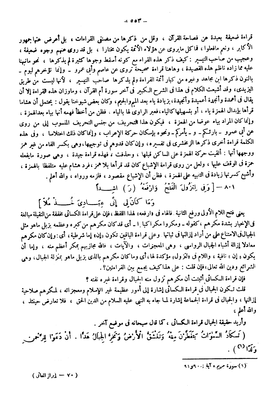 وأريد حقيقة الجبال قراءة الكسائي كما قال سبحانه في موضع آخر: {تَكَادُ السَّمَاوَاتُ يَتَفَطَّرْنَ مِنْهُ وَتَنْشَقُّ الْأَرْضُ وَتَخِرُّ الْجِبَالُ هَدًّا، أَنْ دَعَوْا لِلرَّحْمَنِ وَلَدًا} 1.