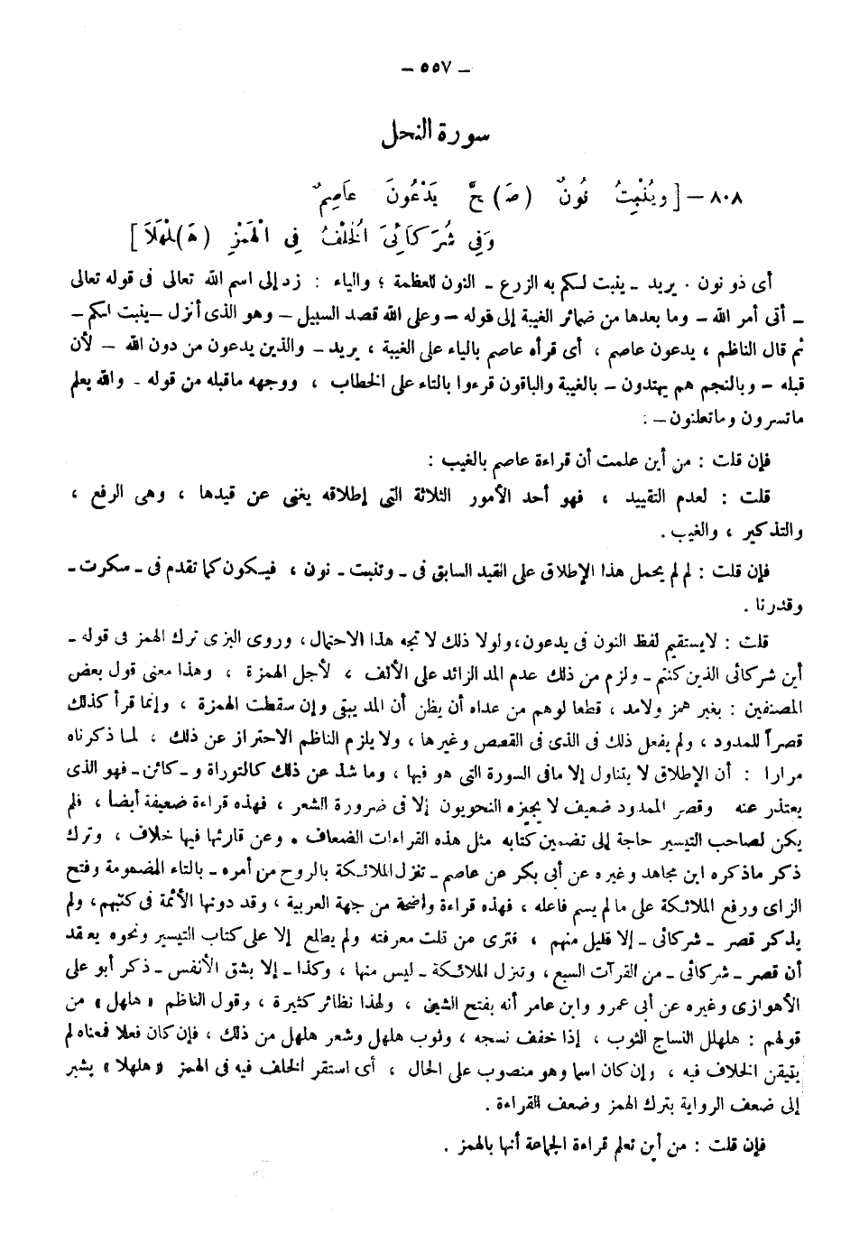 قلت: لا يستقيم لفظ النون في يدعون ولولا ذلك لاتجه هذا الاحتمال، وروى البزي ترك الهمز في قوله: {أَيْنَ شُرَكَائِيَ الَّذِينَ كُنْتُمْ} ، ولزم من ذلك عدم المد الزائد على الألف لأجل الهمزة، وهذا معنى قول بعض المصنفين بغير همز ولا مد قطعا لوهم من عداه أن يظن أن المد يبقى وإن سقطت الهمزة، وإنما قرأ كذلك قصرا للمدود ولم يفعل ذلك في الذي في القصص وغيرها، ولا يلزم الناظم الاحتراز عن ذلك؛ لما ذكرناه مرارا أن الإطلاق لا يتناول إلا ما في السورة التي هو فيها وما شذ عن ذلك كالتوراة و"كائن" فهو الذي يعتذر عنه وقصر الممدود ضعيف لا يجيزه النحويون إلا في ضرورة الشعر فهذه قراءة ضعيفة أيضًا، فلم يكن لصاحب التيسير حاجة إلى تضمين كتابه مثل هذه القراءات الضعاف، وعن قارئها فيها خلاف، وترك ذكر ما ذكره ابن مجاهد وغيره عن أبي بكر عن عاصم: "تنزل الملائكة بالروح من أمره" بالتاء المضمومة وفتح الزاي ورفع الملائكة على ما لم يسمَّ فاعله، فهذه قراءة واضحة من جهة العربية، وقد دونها الأئمة في كتبهم ولم يذكر قصر: "شُرَكَائِيَ" إلا قليل منهم، فترى من قلَّت معرفته ولم يطلع إلا على كتاب التيسير ونحوه يعقد أن قصر: {شُرَكَائِيَ} من القراءات السبع وتنزل الملائكة ليس منها وكذا: {إِلَّا بِشِقِّ الْأَنْفُسِ} ، ذكر أبو علي الأهوازي وغيره عن أبي عمرو وابن عامر أنه بفتح الشين ولهذا نظائر كثيرة وقول الناظم هلهل من قولهم: هلهل النساج الثوب إذا خفف نسجه، وثوب هلهل وشعر هلهل من ذلك فإن كان فعلا فمعناه لم يتيقن الخلاف فيه وإن كان اسما وهو منصوب على الحال؛ أي: استقر الخلف فيه في الهمز "هلهلا" يشير إلى ضعف الرواية بترك الهمز وضعف القراءة.