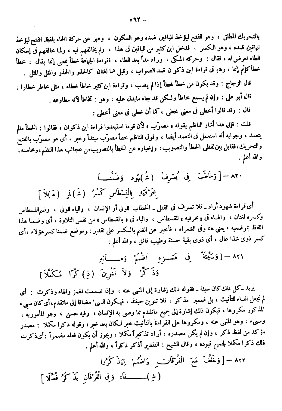 قلت: فإلى هذا أشار الناظم بقوله: مصوب؛ لأن قوما استبعدوا قراءة ابن ذكوان فقالوا الخطأ ما لم يتعمد، وجوابه أنه استعمل في التعمد أيضا، وقول الناظم: خطأ مصوب مبتدأ وخبر؛ أي: هو مصوب بالفتح والتحريك، فقابل بين لفظي الخطأ والتصويب، وإخباره عن الخطأ بالتصويب من عجائب هذا النظم ومحاسنه والله أعلم.