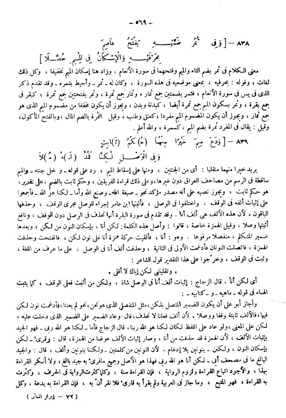 يريد خيرًا منهما منقلبا؛ أي: من الجنتين ومنها على إسقاط الميم رد على قوله: {وَدَخَلَ جَنَّتَهُ} والميم ساقطة في الرسم من مصاحف العراق دون غيرها وعلى ذلك قراءة الفريقين، وحكم ثابت بالضم على تقدير هو حكم ثابت، ويجوز نصبه على أنه مصدر مؤكد نحو: {صِبْغَةَ اللَّهِ} و {صُنْعَ اللَّهِ} ، أما: {لَكِنَّا هُوَ اللَّهُ} فأجمعوا على إثبات ألفه في الوقف واختلفوا في الوصل فأثبتها ابن عامر؛ إجراء للوصل مجرى الوقف وحذفها الباقون؛ لأن هذه الألف هي ألف أنا، وقد تقدم في سورة البقرة أنها تحذف في الوصل دون الوقف، ونافع أثبتها وصلا، وقيل: الهمزة خاصة قالوا: وأصل هذه الكلمة لكن أنا بإسكان النون من لكن وبعدها ضمير المتكلم منفصلا مرفوعا وهو أنا، فألقيت حركة همزة أنا على نون لكن فانفتحت وحذفت الهمزة فاتصلت النونان فأدغمت الأولى في الثانية وحذفت ألف أنا في الوصل على ما عرف من اللغة وثبت في الوقف، وخرجوا على هذا التقدير: قول الشاعر: