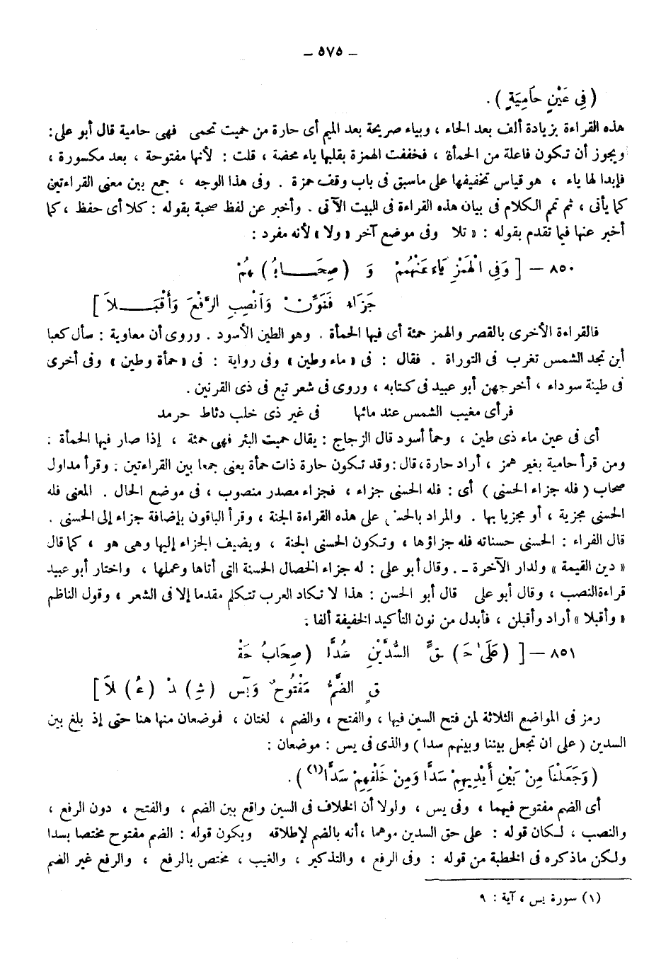 أي: في عين ماء ذي طين، وحمأ أسود، قال الزجاج: يقال حميت البئر فهي حمئة إذا صار فيها الحمأة، ومن قرأ حامية بغير همز أراد حارة، قال: وقد تكون حارة ذات حمأة؛ يعني: جمعا بين القراءتين، وقرأ مدلول صحاب: {فَلَهُ جَزَاءً الْحُسْنَى} أي: فله الحسنى جزاء فجزاء مصدر منصوب في موضع الحال. المعنى: فله الحسنى مجزية أو مجزيا بها. والمراد بالحسنى على هذه القراءة الجنة، وقرأ الباقون بإضافة جزاء إلى الحسنى، قال الفراء: الحسنى حسناته فله جزاؤها، وتكون الحسنى الجنة، ويضيف الجزاء إليها وهي هو، كما قال: {دِينُ الْقَيِّمَةِ} ، و {وَلَدَارُ الْآَخِرَةِ} ، وقال أبو علي: له جزاء الخصال الحسنة التي أتاها وعملها، واختار أبو عبيد قراءة النصب، وقال أبو علي: قال أبو الحسن: هذا لا تكاد العرب تتكلم مقدما إلا في الشعر وقول الناظم: وأقبلا أراد وأقبلن، فأبدل من نون التأكيد الخفيفة ألفا.