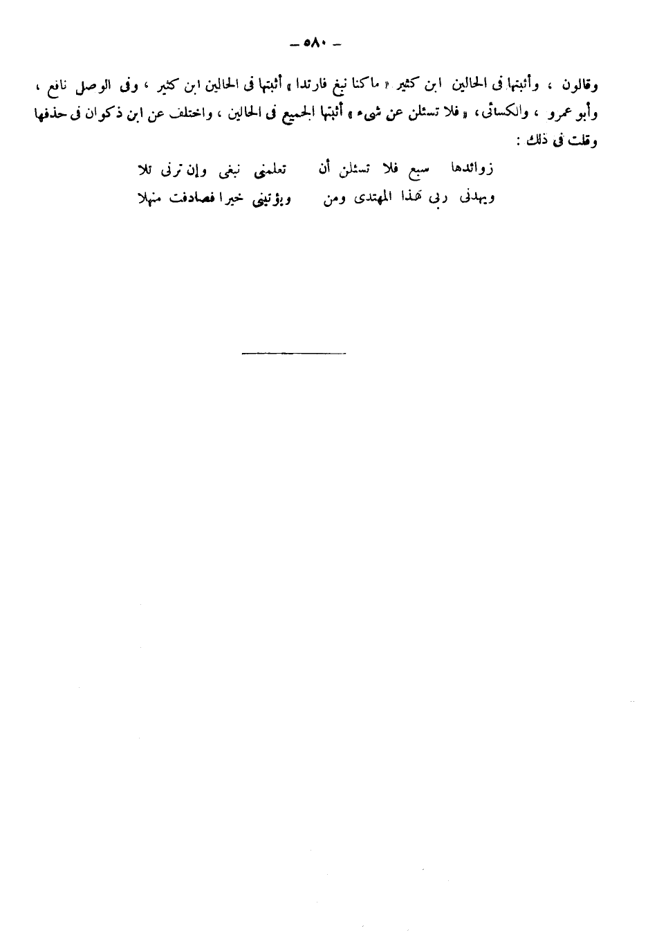 وقالون، وأثبتها في الحالين ابن كثير، {مَا كُنَّا نَبْغِي فَارْتَدَّا} أثبتها في الحالين ابن كثير، وفي الوصل نافع وأبو عمرو والكسائي، {فَلا تَسْأَلْنِي عَنْ شَيْءٍ} أثبتها الجميع في الحالين، واختلف عن ابن ذكوان في حذفها، وقلت في ذلك: