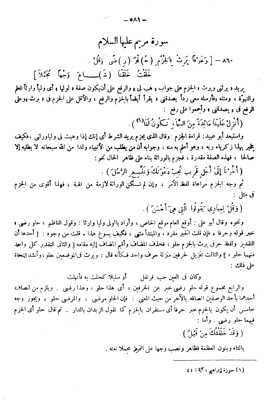 واستبعد أبو عبيد: قراءة الجزم: وقال: الذي يجزم يريد الشرط؛ أي: إنك إذا وهبت لي وليا ورثني، فكيف يخبر بهذا زكرياء ربه وهو أعلم به منه، وجوابه أن من يطلب من الأنبياء ولدًا من الله سبحانه لا يطلبه إلا صالحا فهذه الصفة مقدرة، فجزم بالوراثة بناء على ظاهر الحال نحو: {أَخِّرْنَا إِلَى أَجَلٍ قَرِيبٍ نُجِبْ دَعْوَتَكَ وَنَتَّبِعِ الرُّسُلَ} .