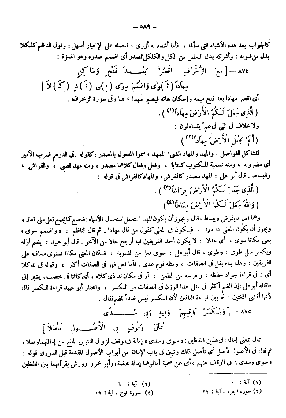 "الذي جعل لكم الأرض مهادا"1. ولا خلاف في التي في عم يتساءلون: {أَلَمْ نَجْعَلِ الْأَرْضَ مِهَادًا} 2؛ لتشاكل الفواصل. والمهد والمهاد: الشيء الممهد سموا المفعول بالمصدر كقوله في الدرهم: ضرب الأمير؛ أي: مضروبه، ومنه تسمية المكتوب كتابا، وفَعْل وفِعَال كلاهما مصدر ومنه مهد الصبي والفراش والبساط، قال أبو علي: المهد مصدر كالفرش والمهاد كالفراش في قوله: {الَّذِي جَعَلَ لَكُمُ الْأَرْضَ فِرَاشًا} 3، {وَاللَّهُ جَعَلَ لَكُمُ الْأَرْضَ بِسَاطًا} 4، وهما اسم ما يفرش ويبسط قال: ويجوز أن يكون المهد استعمل استعمال الأسماء: فجمع كما يجمع فعل على فعال، ويجوز أن يكون المعنى ذا مهد فيكون في المعنى كقول من قال مبادا، ثم قال الناظم: واضمم سوى؛ يعني: "مكانا سوى"؛ أي: عدلا لا يكون أحد الفريقين فيه أرجح حالا من الآخر، قال أبو عبيد: يضم أوله ويكسر مثل طُوى وطِوى، قال أبو علي: سوى فعل من التسوية فكأن المعنى مكانا تستوي مسافته على الفريقين، وهذا بناء يقل في الصفات ومثله قوم عِدى، فأما فعل فهو في الصفات أكثر، وقوله: في ند كلا؛ أي: في قراءة جواد حفظه وحرسه من الطعن أو في مكان ند ذي كلاء؛ أي: كائنا في خصب يشير إلى ما قاله أبو علي: إن الضم أكثر في مثل هذا الوزن في الصفات من الكسر، واختار أبو عبيد قراءة الكسر قال: لأنها أفشى اللغتين، ثم بين قراءة الباقين؛ لأن الكسر ليس ضدا للضم، فقال: