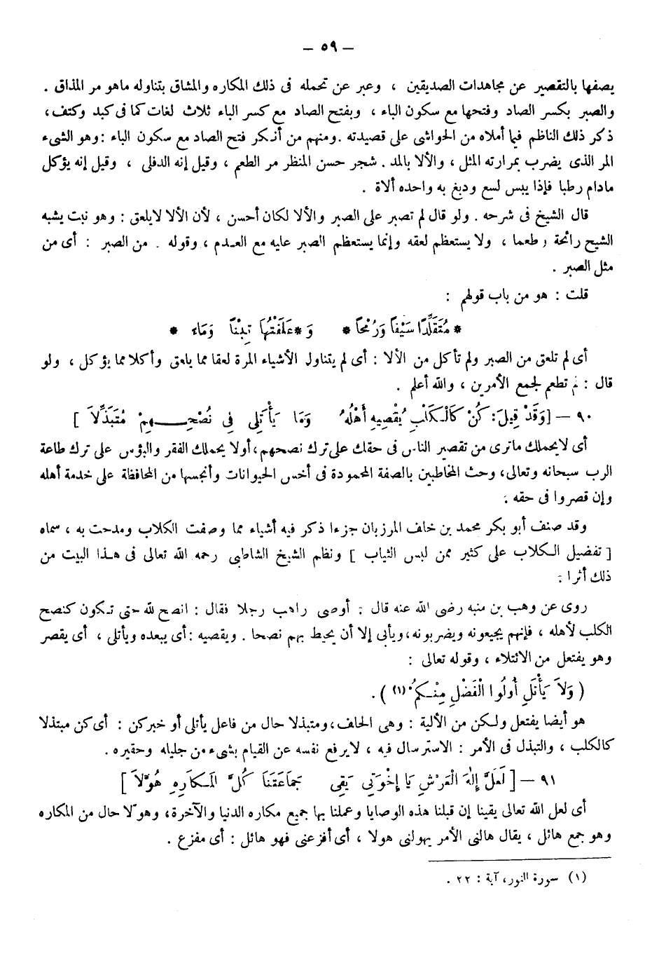 يصفها بالتقصير عن مجاهدات الصديقين وعبر عن تحمله في ذلك المكاره والمشاق بتناوله ما هو مر المذاق، والصبر بكسر الصاد وفتحها مع سكون الباء وبفتح الصاد مع كسر الباء ثلاث لغات كما في كبد وكتف ذكر ذلك الناظم فيما أملاه من الحواشي على قصيدته، ومنهم من أنكر فتح الصاد مع سكون الباء وهو الشي المر الذي يضرب بمرارته المثل والألا بالمد. شجر حسن المنظر مر الطعم وقيل: إنه الدفلى، وقيل: إنه يؤكل ما دام رطبا فإذا يبس لسع ودبغ به، واحده ألاة.