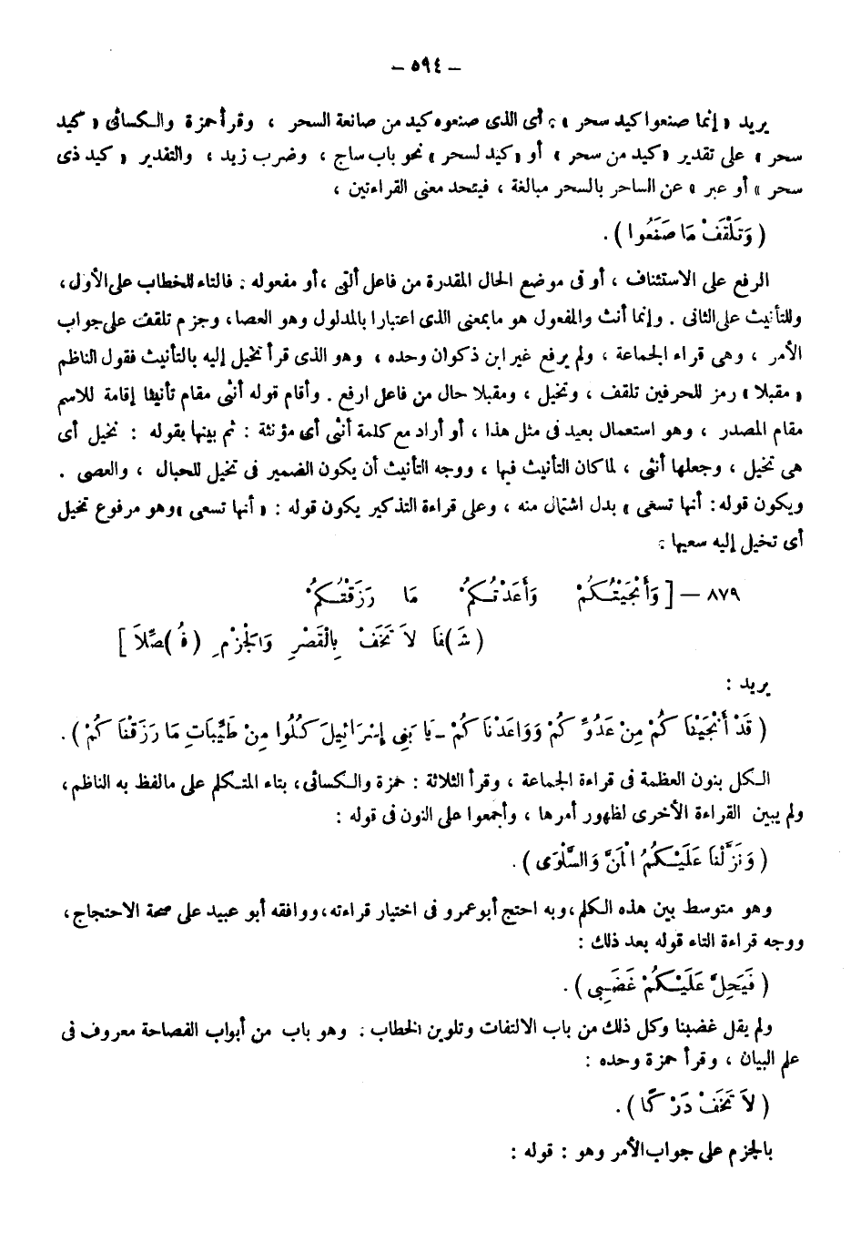 يريد: {قَدْ أَنْجَيْنَاكُمْ مِنْ عَدُوِّكُمْ وَوَاعَدْنَاكُمْ} ، {يَا بَنِي إِسْرائيلَ} ، {كُلُوا مِنْ طَيِّبَاتِ مَا رَزَقْنَاكُمْ} الكل بنون العظمة في قراءة الجماعة، وقرأ الثلاثة؛ حمزة والكسائي بتاء المتكلم على ما لفظ به الناظم، ولم يبين القراءة الأخرى لظهور أمرها، وأجمعوا على النون في قوله: {وَنَزَّلْنَا عَلَيْكُمُ الْمَنَّ وَالسَّلْوَى} ، وهو متوسط بين هذه الكلم وبه احتج أبو عمرو في اختيار قراءته، ووافقه أبو عبيد على صحة الاحتجاج، ووجه قراءة التاء قوله بعد ذلك: {فَيَحِلَّ عَلَيْكُمْ غَضَبِي} ، ولم يقل غضبنا، وكل ذلك من باب الالتفات وتلوين الخطاب، وهو باب من أبواب الفصاحة معروف في علم البيان، وقرأ حمزة وحه: {لا تَخَافُ دَرَكًا} بالجزم على جواب الأمر، وهو قوله: