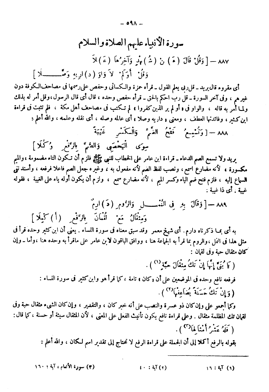 به؛ أي: بما ذكرناه دارم؛ أي: شيخ معمر، وقد سبق معناه في سورة النساء؛ يعني: أن ابن كثير وحده قرأ في مثل هذا في النمل والروم بما قرأ به الجماعة هنا ووافق الباقون لابن عامر على ما قرأ به وحده هنا، أما: {وَإِنْ كَانَ مِثْقَالَ حَبَّةٍ} وفي لقمان: {يَا بُنَيَّ إِنَّهَا إِنْ تَكُ مِثْقَالَ حَبَّةٍ} 1، فرفعه نافع وحده في الموضعين على أن "كان" تامة كما قرأ هو وابن كثير في سورة النساء: "وَإِنْ تَكُ حَسَنَةٌ يُضَاعِفْهَا"2، وكما أجمعوا على: {وَإِنْ كَانَ ذُو عُسْرَةٍ} ، والنصب على أنه خبر كان، والتقدير: وإن كان الشيء مثقال حبة وفي لقمان: تك المظلمة مثقال، وعلى قراءة نافع يكون تأنيث الفعل على المعنى؛ لأن المثقال سيئة أو حسنة كما قال: {فَلَهُ عَشْرُ أَمْثَالِهَا} 3. بقوله: بالرفع أكملا إلى أن الجملة على قراءة الرفع لا تحتاج إلى تقدير اسم لكان والله أعلم.