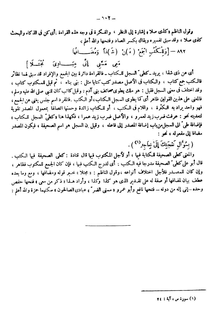 وَلِلْكُتُبِ اجْمَعْ "عَـ"ـنْ "شَـ"ـذًا وَمُضَافُهَا ... مَعِي مَسَّنِي إِنِّي عِبَادِيَ مُجْتَلا