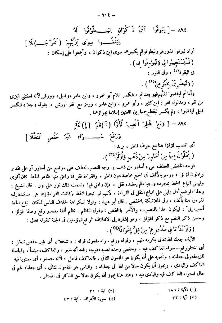 أي: انصب لؤلؤا هنا مع حرف فاطر يريد: {يُحَلَّوْنَ فِيهَا مِنْ أَسَاوِرَ مِنْ ذَهَبٍ وَلُؤْلُؤًا} 3، فوجه الخفض العطف على: {أَسَاوِرَ مِنْ ذَهَبٍ} ووجه النصب العطف على موضع من "أساور" أو على تقدير "ويحلون لؤلؤا" ورسم بالألف في الحج خاصة دون فاطر والقراءة نقل فما وافق منها ظاهر الخط كان أقوى، وليس اتباع الخط بمجرده واجبا ما لم يعضده نقل، فإن وافق فبها ونعمت ذلك نور على نور، قال الشيخ: وهذا الموضع أدل دليل على اتباع النقل في القراءة؛ لأنهم لو اتبعوا الخط وكانت القراءة إنما هي مستندة إليه لقرءوا هنا بألف، وفي الملائكة بالخفض، قال أبو عبيد: ولولا الكراهة لخلاف الناس لكان اتباع الخط أحب إلي فيكون هذا بالنصب، والآخر بالخفض وقول الناظم نظم إلفة مصدر وقع وصفا للؤلؤ، وحسن ذكر النظم مع ذكر اللؤلؤ، وهو إشارة إلى الائتلاف الواقع للمؤمنين في الجنة كقوله تعالى: {وَنَزَعْنَا مَا فِي صُدُورِهِمْ مِنْ غِلٍّ إِخْوَانًا} 4 ... الآية جعلنا الله تعالى بكرمه منهم، وقوله: ورفع سواء مفعول قوله: "تنخلا"؛ أي: غير حفص تنخل؛ أي: اختار رفع "سواءٌ العاكفُ فيه" وحفص وحده نصبه، فوجه رفعه أنه خبر، والعاكف مبتدأ والجملة ثاني مفعولي جعلناه، ونصبه على أن يكون هو المفعول الثاني، فالعاكف فاعل؛ لأنه مصدر؛ أي: مستويا فيه العاكف والبادي ويجوز أن يكون حالا من الهاء في جعلناه، وللناس هو المفعول الثاني؛ أي: جعلناه لهم في حال استواء العاكف فيه، والبادي فيه، وعند هذا يجوز أن يكون حالا من الذكر في المستقر.