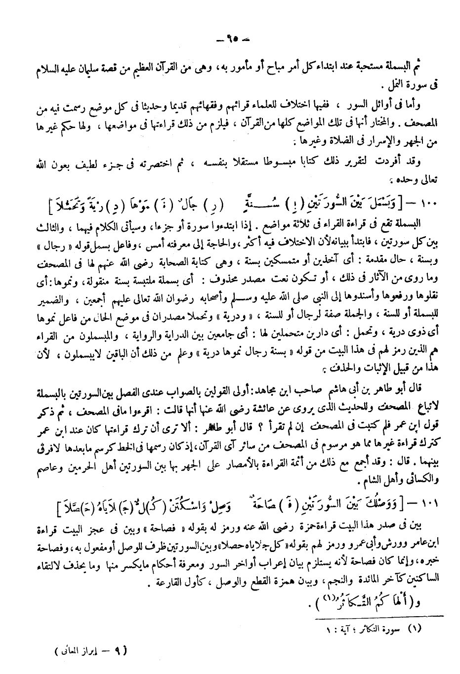 بين في صدر هذا البيت قراءة حمزة -رضي الله عنه- ورمز له بقوله: فصاحة وبين في عجز البيت قراءة ابن عامر وورش وأبي عمرو، ورمز لهم بقوله: كل جلاياه حصلا، وبين السورتين ظرف للوصل أو مفعول به وفصاحة خبره، وإنما كان فصاحة؛ لأنه يستلزم بيان إعراب أواخر السور ومعرفة أحكام ما يكسر منها وما يحذف؛ لالتقاء الساكنين كآخر المائدة والنجم وبيان همزة القطع والوصل كأول القارعة، و {أَلْهَاكُمُ التَّكَاثُرُ} 1.