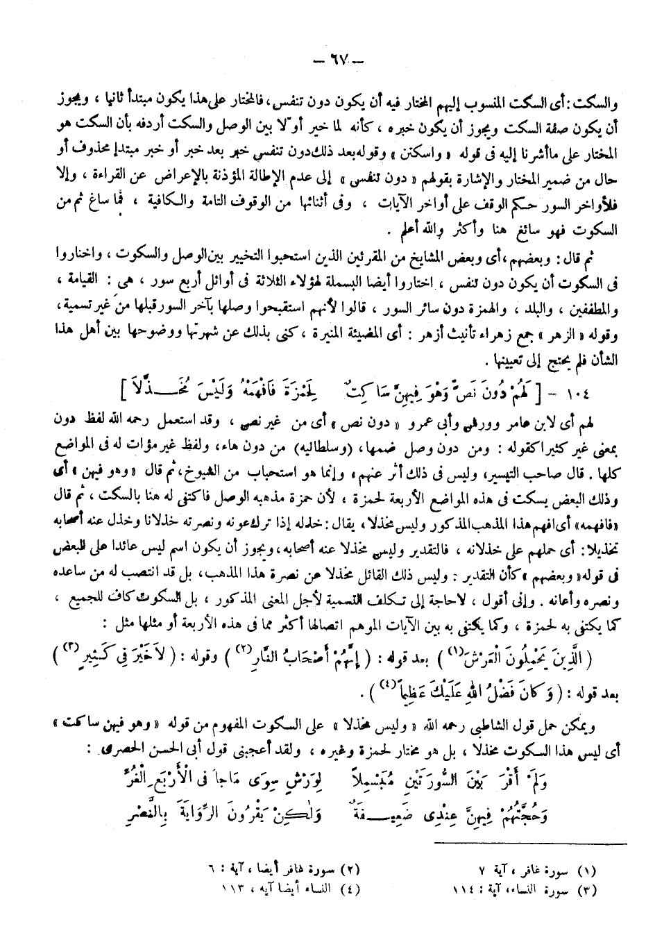 ويمكن حمل قول الشاطبي -رحمه الله- وليس مخذلا على السكوت المفهوم من قوله: وهو فيهن ساكت أي ليس هذا السكوت مخذلا بل هو مختار لحمزة وغيره، ولقد أعجبني قول أبي الحسن الحصري: