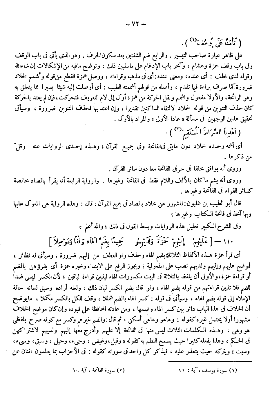على ظاهر عبارة صاحب التيسير، والرابع ضم الشفتين بعد سكون الحرف، وهو الذي يأتي في باب الوقف وفي باب وقف حمزة وهشام وآخر باب الإدغام على ما سنبين ذلك ونوضح ما فيه من الإشكالات إن شاء الله، وقوله: لدى خلف أي عنده ومعنى عنده أي في مذهبه وقراءته، ووصل همزة القطع من قوله: وأشمم لخلاد ضرورة كما صرف براءة فيما تقدم وأصله من قولهم أشممته الطيب أي أوصلت إليه شيئا يسيرا مما يتعلق به وهو الرائحة، والأول مفعول "واشمم"، ونقل الحركة من همزة أول إلى لام التعريف فتحركت، فإن لم يعتد بالحركة كان حذف التنوين من قوله لخلاد؛ لالتقاء الساكنين تقديرا، وإن اعتد بها فحذف التنوين ضرورة، وسيأتي تحقيق هذين الوجهين في مسألة: "عادا الأولى" والمراد بالأول: {اهْدِنَا الصِّرَاطَ الْمُسْتَقِيمَ} 2؛ أي أشمه وحده خلاد دون ما بقي في الفاتحة وفي جميع القرآن، وهذه إحدى الروايات عنه وقلَّ من ذكرها.