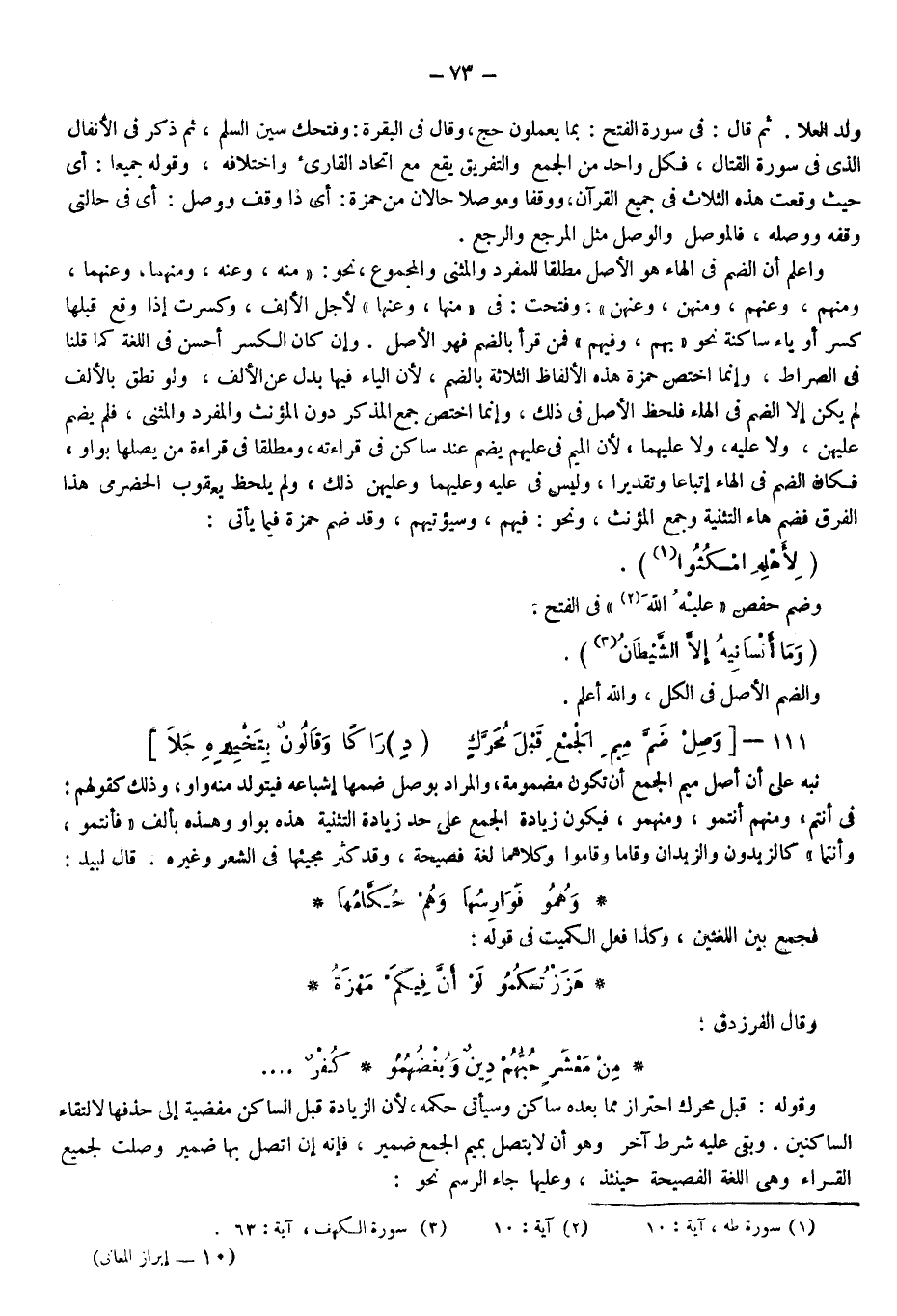وأعلم أن الضم في الهاء هو الأصل مطلقا للمفرد والمثنى والمجموع نحو: "منه وعنه ومنهما وعنهما ومنهم وعنهم ومنهن وعنهن"، وفتحت: في "منها وعنها" لأجل الألف وكسرت إذا وقع قبلها كسر أو ياء ساكنة نحو بهم وفيهم فمن قرأ بالضم فهو الأصل، وإن كان الكسر أحسن في اللغة كما قلنا في الصراط وإنما اختص حمزة هذه الألفاظ الثلاثة بالضم؛ لأن الياء فيها بدل عن الألف ولو نطق بالألف لم يكن إلا الضم في الهاء فلحظ الأصل في ذلك وإنما اختص جمع المذكر دون المؤنث والمفرد والمثنى فلم يضم عليهن ولا عليه ولا عليهما؛ لأن الميم في عليهم يضم عند ساكن في قراءته ومطلقا في قراءة من يصلها بواو فكان الضم في الهاء إتباعا وتقديرا وليس في عليه وعليهما وعليهن ذلك ولم يلحظ يعقوب الحضرمي هذا الفرق فضم هاء التثنية وجمع المؤنث ونحو فيهم وسيؤتيهم وقد ضم حمزة فيما يأتي:
