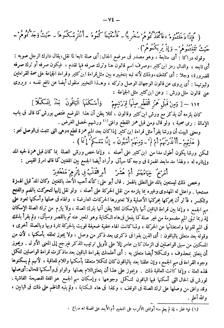 ومعنى البيت: أن ورشا يقرأ مثل قراءة ابن كثير إذا كان بعد الميم همزة قطع، وهي التي تثبت في الوصل نحو: {عَلَيْهِمْ} ، {أَأَنْذَرْتَهُمْ أَمْ لَمْ} ، {وَمِنْهُمْ أُمِّيُّونَ} ، {إِنَّا مَعَكُمْ إِنَّمَا} .