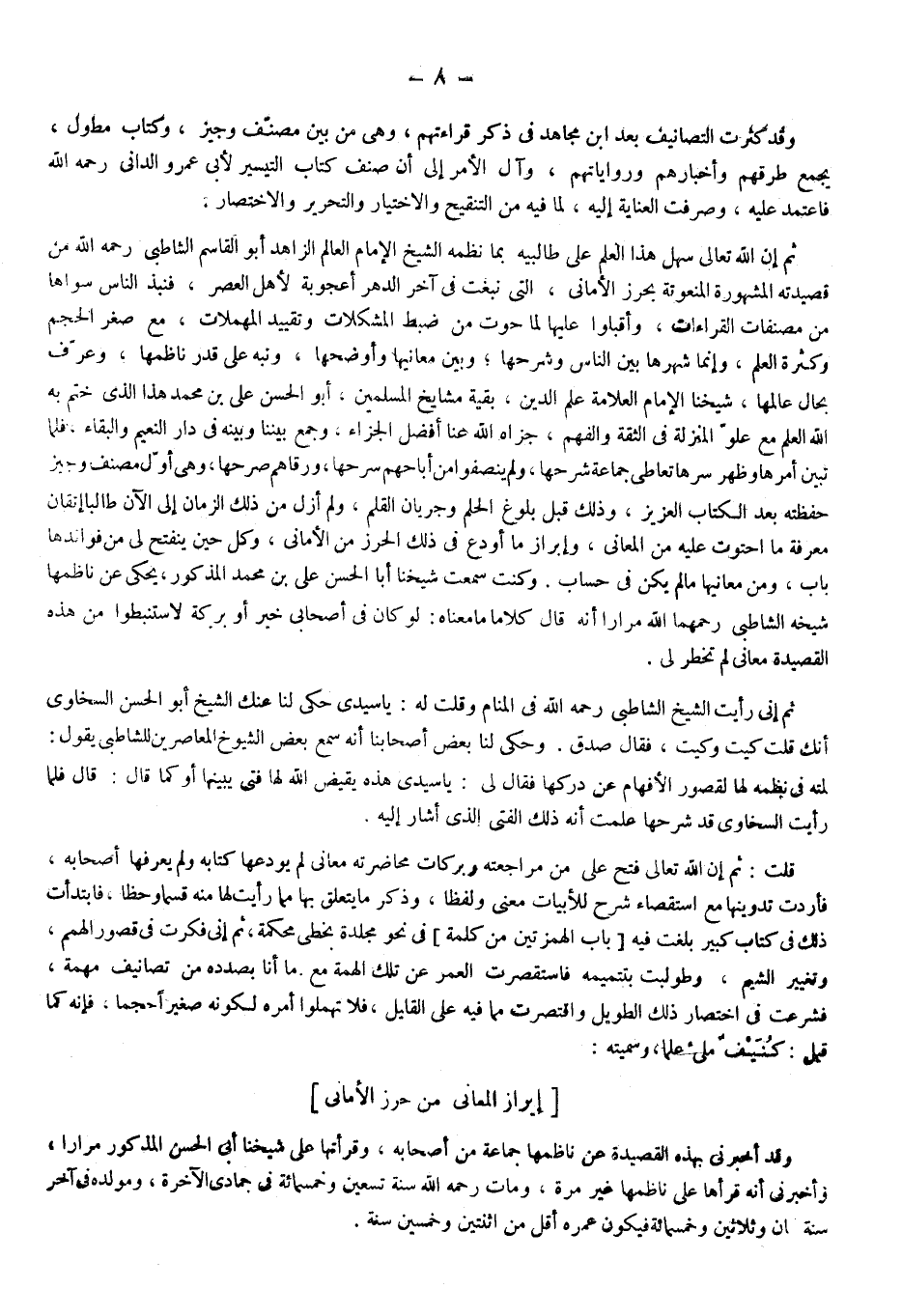 ثم إن الله تعالى سهل هذا العلم على طالبيه بما نظمه الشيخ الإمام العالم الزاهد أبو القاسم الشاطبي رحمه الله من قصيدته المشهورة المنعوتة بحرز الأماني، التي نبغت في آخر الدهر أعجوبة لأهل العصر، فنبذ الناس سواها من مصنفات القراءات، وأقبلوا عليها لما حوت من ضبط المشكلات وتقييد المهملات، مع صغر الحجم وكثرة العلم، وإنما شهرها بين الناس شرحها؛ وبين معانيها وأوضحها، ونبه على قدر ناظمها، وعرف بحال عالمها، شيخنا الإمام العلامة علم الدين، بقية مشايخ المسلمين، أبو الحسن على بن محمد هذا الذي ختم به الله العلم مع علو المنزلة في الثقة والفهم، جزاه الله عنا أفضل الجزاء، وجمع بيننا وبينه في دار النعيم والبقاء. فلما تبين أمرها وظهر سرها تعاطى جماعة شرحها، ولم ينصفوا من أباحهم سرحها، ورقاهم صرحها، وهي أول مصنف وجيز حفظته بعد الكتاب العزيز، وذلك قبل بلوغ الحلم وجريان القلم، ولم أزل من ذلك الزمان إلى الآن طالبا إتقان باب، ومن معانيها ما لم يكن في حساب. وكنت سمعت شيخنا أبا الحسن علي بن محمد المذكور، يحكي عن ناظمها شيخه الشاطبي رحمها الله مرارا أنه قال كلاما ما معناه: لو كان في أصحابي خير أو بركة لاستنبطوا من هذه القصيدة معاني لم تخطر لي.
