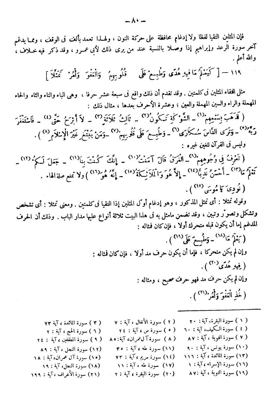 مثَّل التقاء المثلين في كلمتين، وقد تقدم أن ذلك واقع في سبعة عشر حرفا وهي الباء والتاء والثاء والحاء المهملة والراء والسين المهملة والعين وعشرة الأحرف بعدها مثال ذلك: {لَذَهَبَ بِسَمْعِهِمْ} 1، {الشَّوْكَةِ تَكُونُ} 2، {ثَالِثُ ثَلاثَةٍ} 3، {لا أَبْرَحُ حَتَّى} 4، {فَاسْتَغْفَرَ رَبَّهُ} 5، {وَتَرَى النَّاسَ سُكَارَى} 6، {وَطُبِعَ عَلَى قُلُوبِهِمْ} 7، {وَمَنْ يَبْتَغِ غَيْرَ الْإِسْلامِ} 8. وليس في القرآن للغين غيره: {تَعْرِفُ فِي وُجُوهِهِمْ} 9، {الْغَرَقُ قَالَ آمَنْتُ} 10، {إِنَّكَ كُنْتَ بِنَا} 11، {جَعَلَ لَكُمُ} 12، {تَعْلَمُ مَا} 13، {أَحْسَنُ نَدِيًّا} 14، {إِلَّا هُوَ وَالْمَلائِكَةُ} 15، {إِنَّهُ هُوَ} 16 ولا تمنع صلة الهاء. {نُودِيَ يَا مُوسَى} 17.