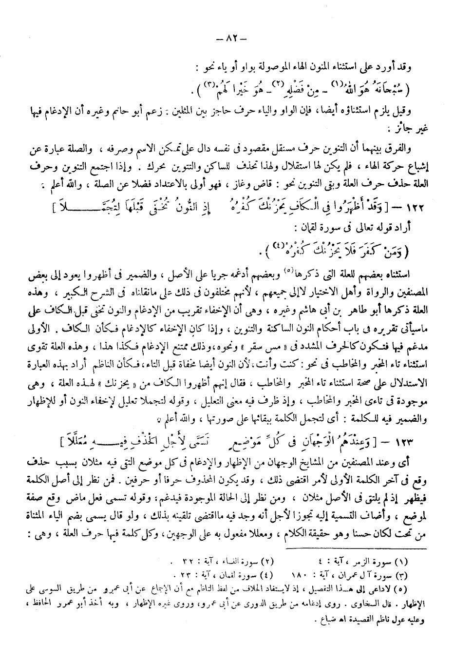 وقد أورد على استثناء المنون الهاء الموصولة بواو أو ياء نحو: {سُبْحَانَهُ هُوَ اللَّهُ} 1، {مِنْ فَضْلِهِ} 2، {هُوَ خَيْرًا لَهُمْ} 3.