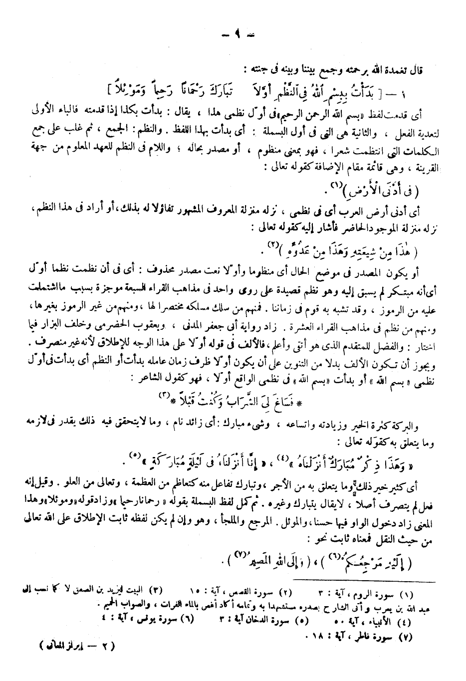 بَدَأْتُ بِبِسْمِ اْللهُ فيِ النَّظْمِ أوَّلاَ ... تَبَارَكَ رَحْمَاناً رَحِيماً وَمَوْئِلاَ