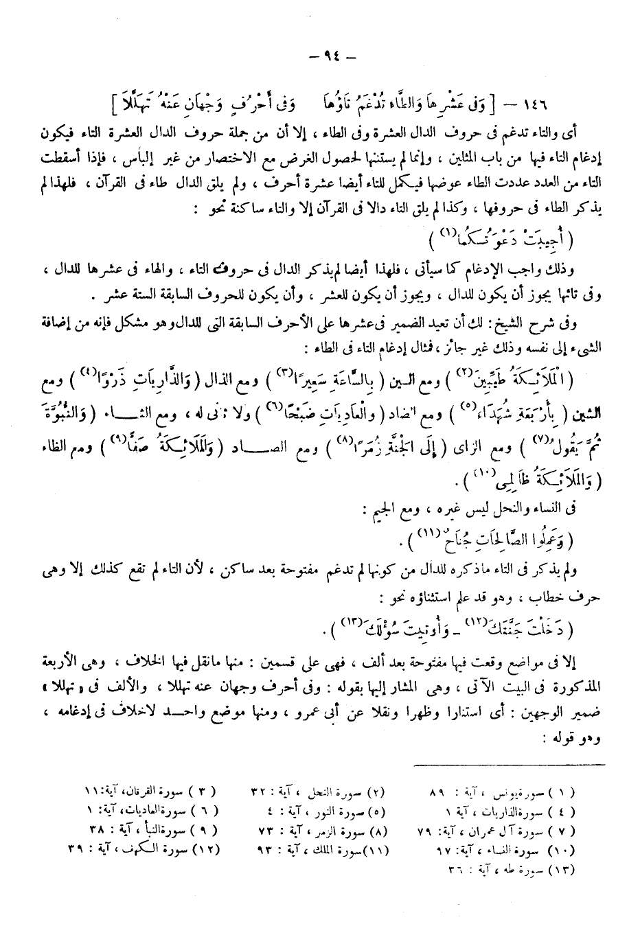 وذلك واجب الإدغام كما سيأتي فلهذا أيضا لم يذكر الدال في حروف التاء والهاء في عشرها للدال وفي تائها يجوز أن يكون للدال ويجوز أن يكون للعشر وأن يكون للحروف السابقة الستة عشر، وفي شرح الشيخ لك أن تعيد الضمير في عشرها على الأحرف السابقة التي للدال وهو مشكل فإنه من إضافة الشيء إلى نفسه وذلك غير جائز فمثال إدغام التاء في الطاء: {الْمَلائِكَةُ طَيِّبِينَ} 2، ومع السين: {بِالسَّاعَةِ سَعِيرًا} 3، ومع الذال: {وَالذَّارِيَاتِ ذَرْوًا} 4، ومع الشين: {بِأَرْبَعَةِ شُهَدَاء} 5، ومع الضاد: {وَالْعَادِيَاتِ ضَبْحًا} 6، ولا ثاني له، ومع الثاء: {وَالنُّبُوَّةَ ثُمَّ يَقُولَ} 7، ومع الزاي: {إِلَى الْجَنَّةِ زُمَرًا} 8، ومع الصاد: {وَالْمَلائِكَةُ صَفًّا} 9، ومع الظاء: {الْمَلائِكَةُ ظَالِمِي} 10.