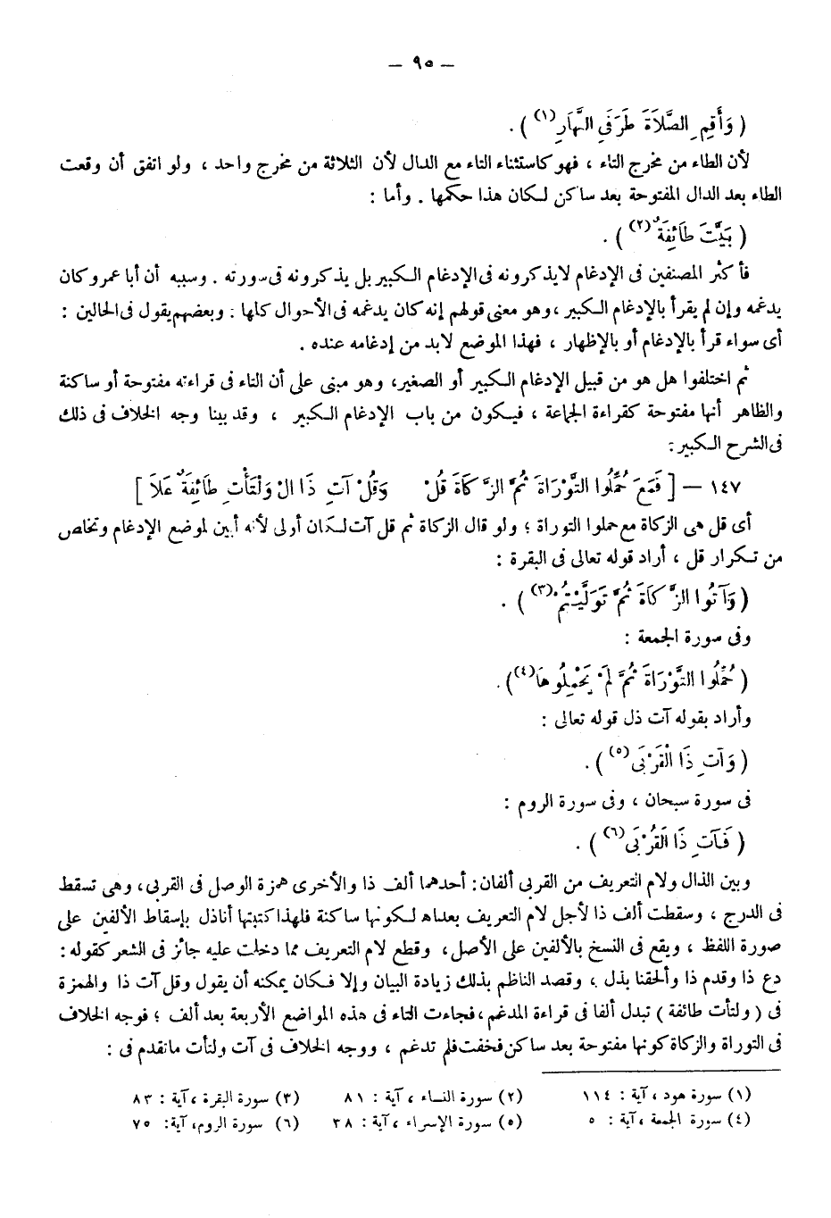 وبين الذال ولام التعريف من القربي ألفان: أحدهما ألف ذا والأخرى همزة الوصل في القربى وهي تسقط في الدرج وسقطت ألف ذا لأجل لام التعريف بعدها؛ لكونها ساكنة فلهذا كتبتها أناذل بإسقاط الألفين على صورة اللفظ ويقع في النسخ بالألفين على الأصل وقطع لام التعريف مما دخلت عليه جائز في الشعر كقوله: دع ذا وقدم ذا وألحقنا بذل، وقصد الناظم بذلك زيادة البيان وإلا فكان يمكنه أن يقو وقل آت ذا والهمزة في: {وَلْتَأْتِ طَائِفَةٌ} تبدل ألفا في قراءة المدغم فجاءت التاء في هذه المواضع الأربعة بعد ألف، فوجه الخلاف في التوراة والزكاة كونها مفتوحة بعد ساكن فخفت فلم تدغم، ووجه الخلاف في آت ولتأت ما تقدم في: