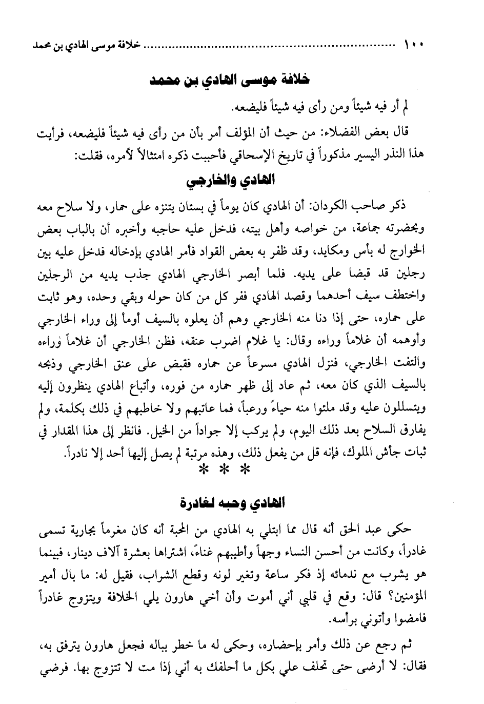 ذكر صاحب الكردان: أن الهادي كان يوماً في بستان يتنزه على حمار، ولا سلاح معه وبحضرته جماعة، من خواصه وأهل بيته، فدخل عليه حاجبه وأخبره أن بالباب بعض الخوارج له بأس ومكايد، وقد ظفر به بعض القواد فأمر الهادي بإدخاله فدخل عليه بين رجلين قد قبضا على يديه. فلما أبصر الخارجي الهادي جذب يديه من الرجلين واختطف سيف أحدهما وقصد الهادي ففر كل من كان حوله وبقي وحده، وهو ثابت على حماره، حتى إذا دنا منه الخارجي وهم أن يعلوه بالسيف أومأ إلى وراء الخارجي وأوهمه أن غلاماً وراءه وقال: يا غلام اضرب عنقه، فظن الخارجي أن غلاماً وراءه والتفت الخارجي، فنزل الهادي مسرعاً عن حماره فقبض على عنق الخارجي وذبحه بالسيف الذي كان معه، ثم عاد إلى ظهر حماره من فوره، وأتباع الهادي ينظرون إليه ويتسللون عليه وقد ملئوا منه حياءً ورعباً، فما عاتبهم ولا خاطبهم في ذلك بكلمة، ولم يفارق السلاح بعد ذلك اليوم، ولم يركب إلا جواداً من الخيل. فانظر إلى هذا المقدار في ثبات جأش الملوك، فإنه قل من يفعل ذلك، وهذه مرتبة لم يصل إليها أحد إلا نادراً.