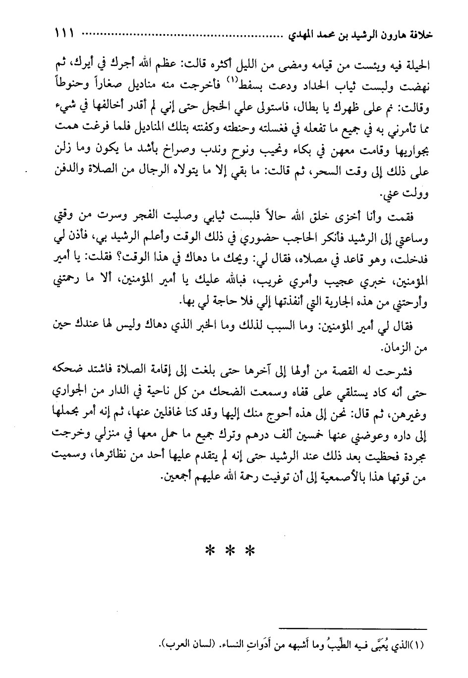 الحيلة فيه ويئست من قيامه ومضى من الليل أكثره قالت: عظم الله أجرك في أيرك، ثم نهضت ولبست ثياب الحداد ودعت بسفط فأخرجت منه مناديل صغاراً وحنوطاً وقالت: نم عل ظهرك يا بطال، فاستولى علي الخجل حتى إني لم أقدر أخالفها في شيء مما تأمرني به في جميع ما تفعله في فغسلته وحنطته وكفنته بتلك المناديل فلما فرغت همت بجواريها وقامت معهن في بكاء ونحيب ونوحٍ وندب وصراخ بأشد ما يكون وما زلن على ذلك إلى وقت السحر، ثم قالت: ما بقي إلا ما يتولاه الرجال من الصلاة والدفن وولت عني. فقمت وأنا أخزى خلق الله حالاً فلبست ثيابي وصليت الفجر وسرت من وقتي وساعتي إلى الرشيد فأنكر الحاجب حضوري في ذلك الوقت وأعلم الرشيد بي، فأذن لي فدخلت، وهو قاعد في مصلاه، فقال لي: ويحك ما دهاك في هذا الوقت؟ فقلت: يا أمير المؤمنين، خبري عجيب وأمري غريب، فبالله عليك يا أمير المؤمنين، ألا ما رحمتني وأرحتني من هذا الجارية التي أنفذتها إلي فلا حاجة لي بها.