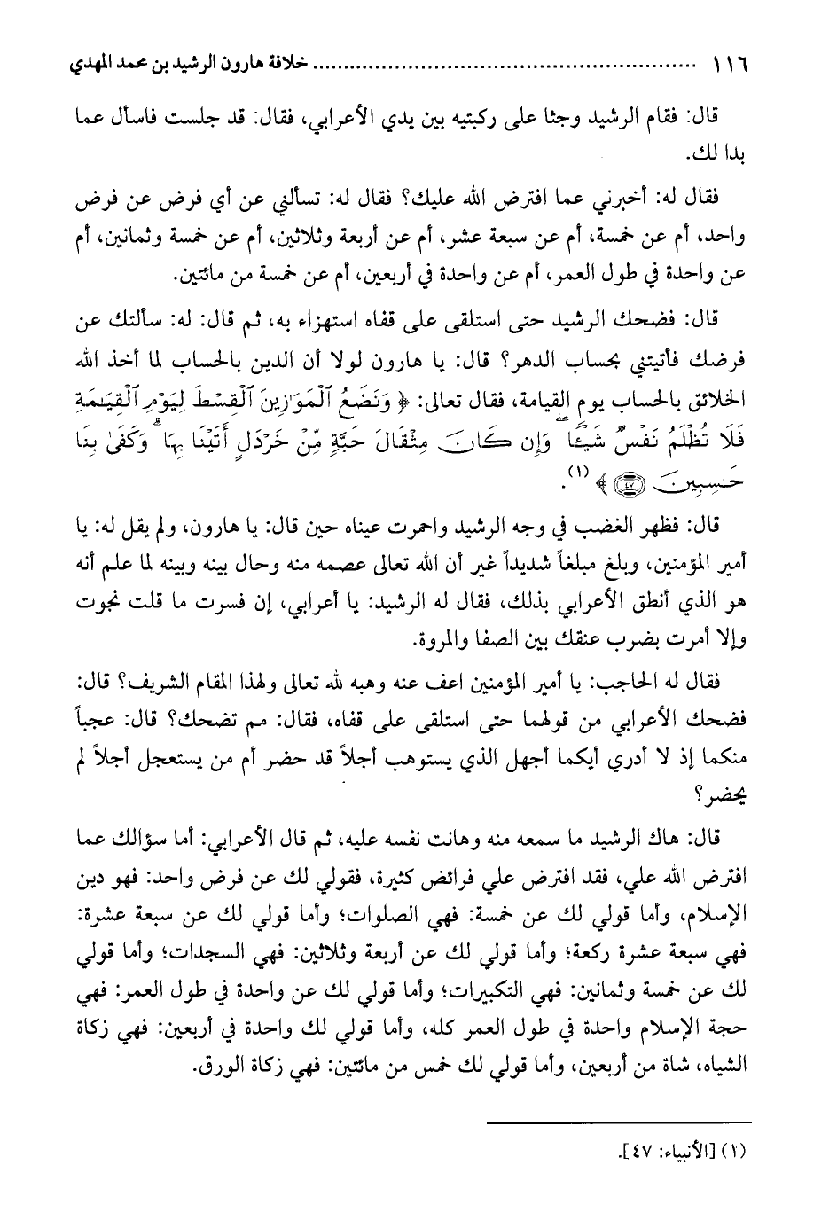 قال: هاك الرشيد ما سمعه منه وهانت نفسه عليه، ثم قال: الأعرابي: أما سؤالك عما افترض الله علي، فقد افترض علي فرائض كثيرة، فقولي لك عن فرض واحد: فهو دين الإسلام، وأما قولي لك عن خمسة: فهي الصلوات؛ وأما قولي لك عن سبعة عشرة: فهي سبعة عشرة ركعة؛ وأما قولي لك عن أربعة وثلاثين: فهي السجدات؛ وما قولي لك عن خمسة وثمانين: فهي التكبيرات؛ وأما قولي لك عن واحدة في طول العمر: فهي حجة الإسلام واحدة في طول العمر كله، وأما قولي لك واحدة في أربعين: فهي زكاة الشياه، شاة من أربعين، وأما قولي لك خمس من مائتين: فهي زكاة الورق.