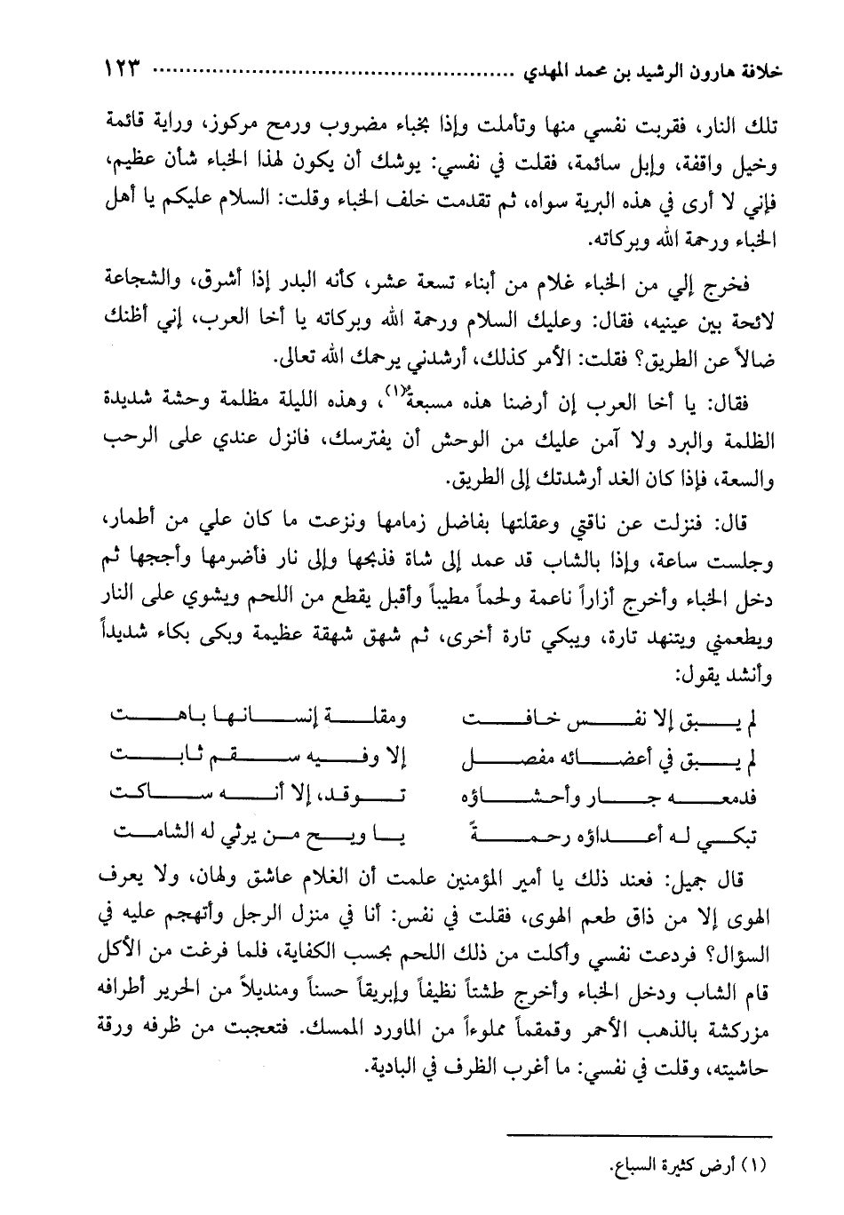 قال جميل: فعند ذلك يا أمير المؤمنين علمت أن الغلام عاشق ولهان، ولا يعرف الهوى إلا من ذاق طعم الهوى، فقلت في نفس: أنا في منزل الرجل وأتهجم عليه في السؤال؟ فردعت نفسي وأكلت من ذلك اللحم بحسب الكفاية، فلما فرغت من الأكل قام الشاب ودخل الخباء وأخرج طشتاً نظيفاً وإبريقاً حسناً ومنديلاً من الحرير أطرافه مزركشة بالذهب الأحمر وقمقماً مملوءاً من الماورد الممسك. فتعجبت من ظرفه ورقة حاشيته، وقلت في نفسي: ما أغرب الظرف في البادية.