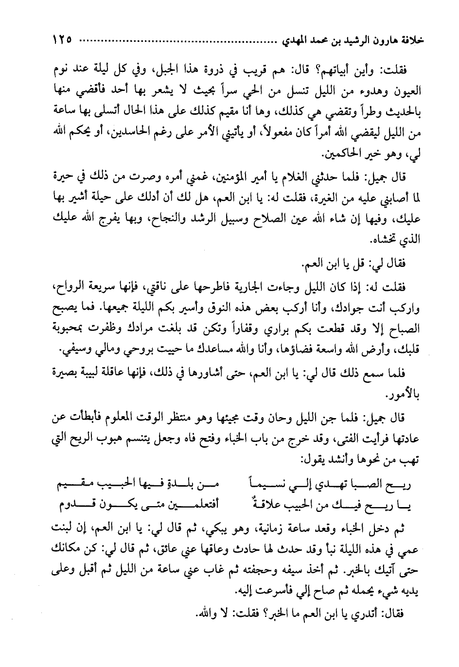 قال جميل: فلما حدثني الغلام يا أمير المؤمنين، غمني أمره وصرت من ذلك في حيرة لما أصابني عليه من الغيرة، فقلت له: يا ابن العم، هل لك أن أدلك على حيلة أشير بها عليك، وفيها إن شاء الله عين الصلاح وسبيل الرشد والنجاح، وبها يفرج الله عليك الذي تخشاه.