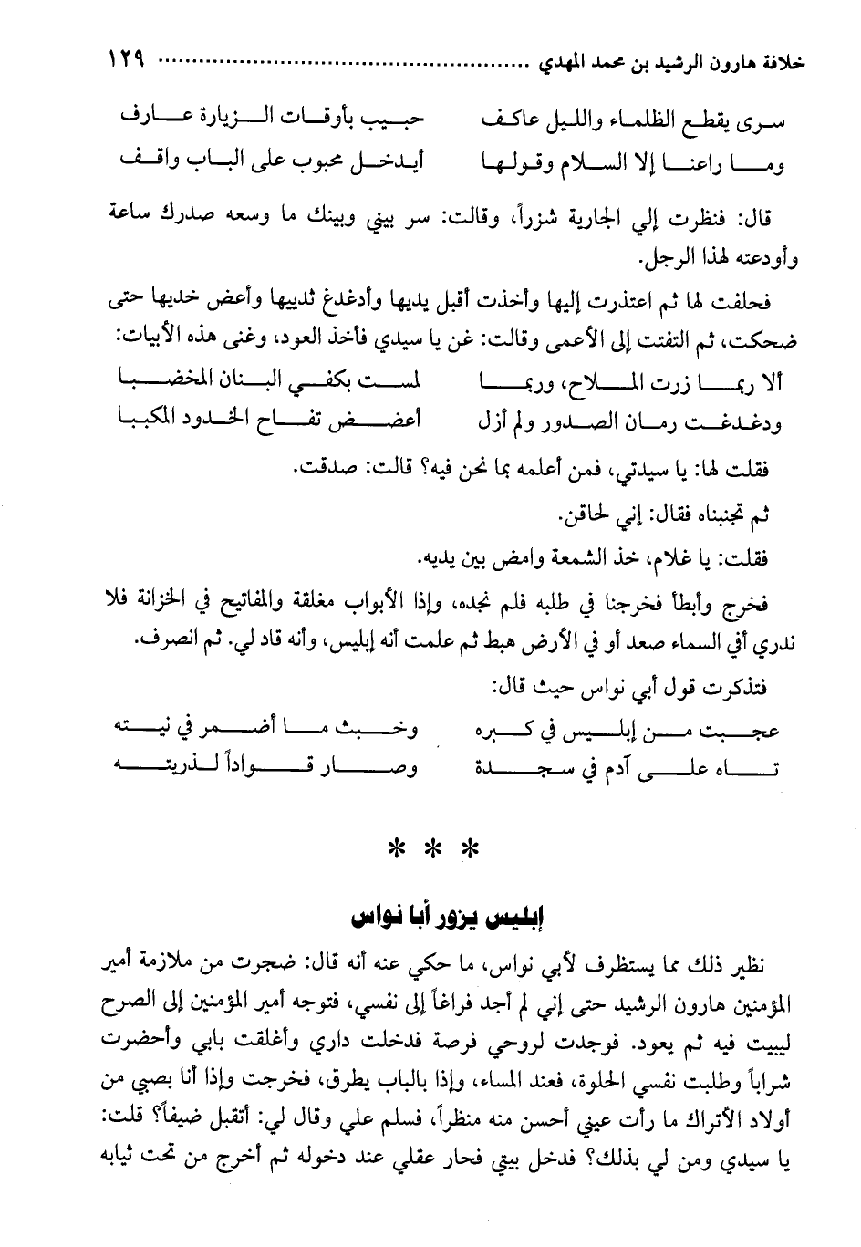 فخرج وأبطأ فخرجنا في طلبه فلم نجده، وإذا الأبواب مغلقة والمفاتيح في الخزانة فلا ندري أفي السماء صعد أو في الأرض هبط ثم علمت أنه إبليس، وأنه قاد لي. ثم انصرف. فتذكرت قول أبي نواس حيث قال:
