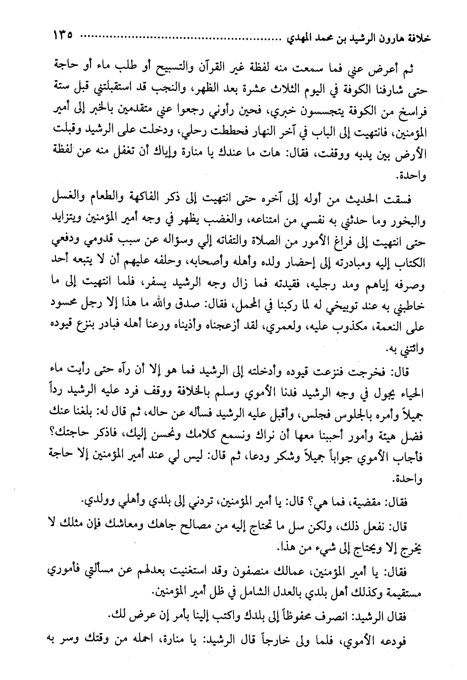 فسقت الحديث من أوله إلى آخره حتى انتهيت إلى ذكر الفاكهة والطعام والغسل والبخور وما حدثني به نفسي من امتناعه، والغضب يظهر في وجه أمير المؤمنين ويتزايد حتى انتهيت إلى فراغ الأمور من الصلاة والتفاته إلي وسؤاله عن سبب قدومي ودفعي الكتاب إليه ومبادرته إلى إحضار ولده وأهله وأصحابه، وحلفه عليهم أن لا يتبعه أحد وصرفه إياهم ومد رجليه، فقيدته فما زال وجه الرشيد يسفر، فلما انتهيت إلى ما خاطبني به عند توبيخي له لما ركبنا في المحمل، فقال: صدق واله ما هذا إلا رجل محسود على النعمة، مكذوب عليه، ولعمري، لقد أزعجناه وأذيناه ورعنا أهله فبادر بنزع قيوده وائتني به.