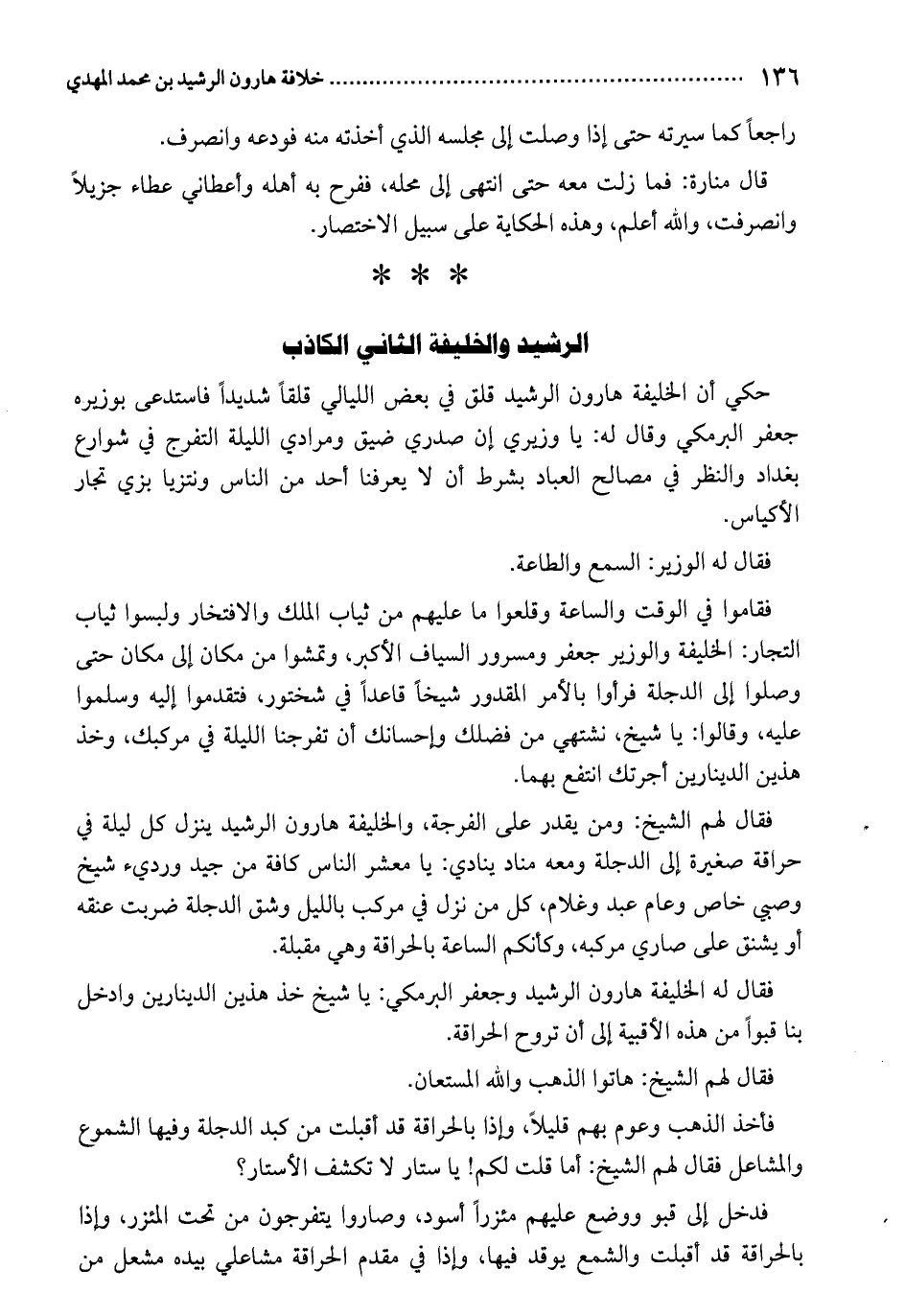 فقال له الخليفة هارون الرشيد وجعفر البرمكي: يا شيخ خذ هذين الدينارين وادخل بنا قبواً من هذه الأقبية إلى أن تروح الحراقة.