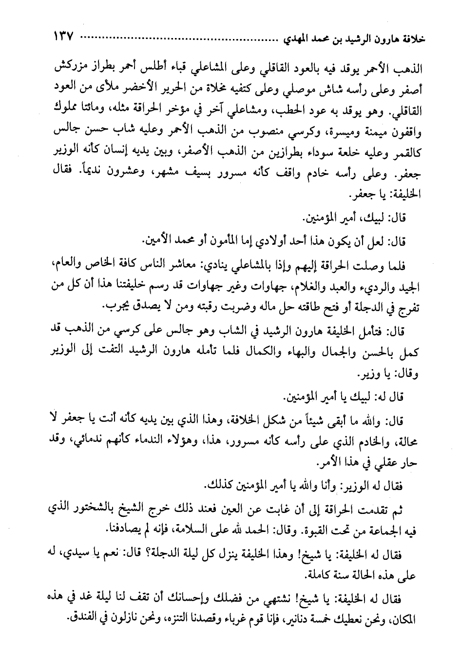 الذهب الأحمر يوقد فيه بالعود القاقلي وعلى المشاعلي قباء أطلس أحمر بطراز مزركش أصفر وعلى رأسه شاش موصلي وعلى كتفيه مخلاة من الحرير الأخضر ملأى من العود القاقلي. وهو يوقد به عوض الحطب، ومشاعلي آخر في مؤخر الحراقة مثله، ومائتا مملوك واقفون ميمنة ومسيرة، وكرسي منصوب من الذهب الأحمر وعليه شاب حسن جالس كالقمر وعليه خلعة سوداء بطرازين من الذهب الأصفر، وبين يديه إنسان كأنه الوزير جعفر. وعلى رأسه خادم واقف كأنه مسرور بسيف مشهر، وعشرون نديماً. فقال الخليفة: يا جعفر.