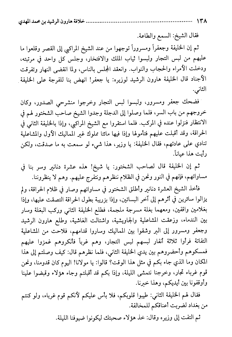 ثم إن الخليفة وجعفراً ومسروراً توجهوا من عند الشيخ المراكبي إلى القصر وقلعوا ما عليهم من لبس التجار ولبسوا ثياب الملك والافتخار، وجلس كل واحد في مرتبته، ودخلت الأمراء والحجاب والنواب. وانعقد المجلس بالناس، ولما انقضى النهار وتفرقت الأجناد قال الخليفة هارون الرشيد لوزيره: يا جعفر! انهض بنا للفرجة على الخليفة الثاني.
