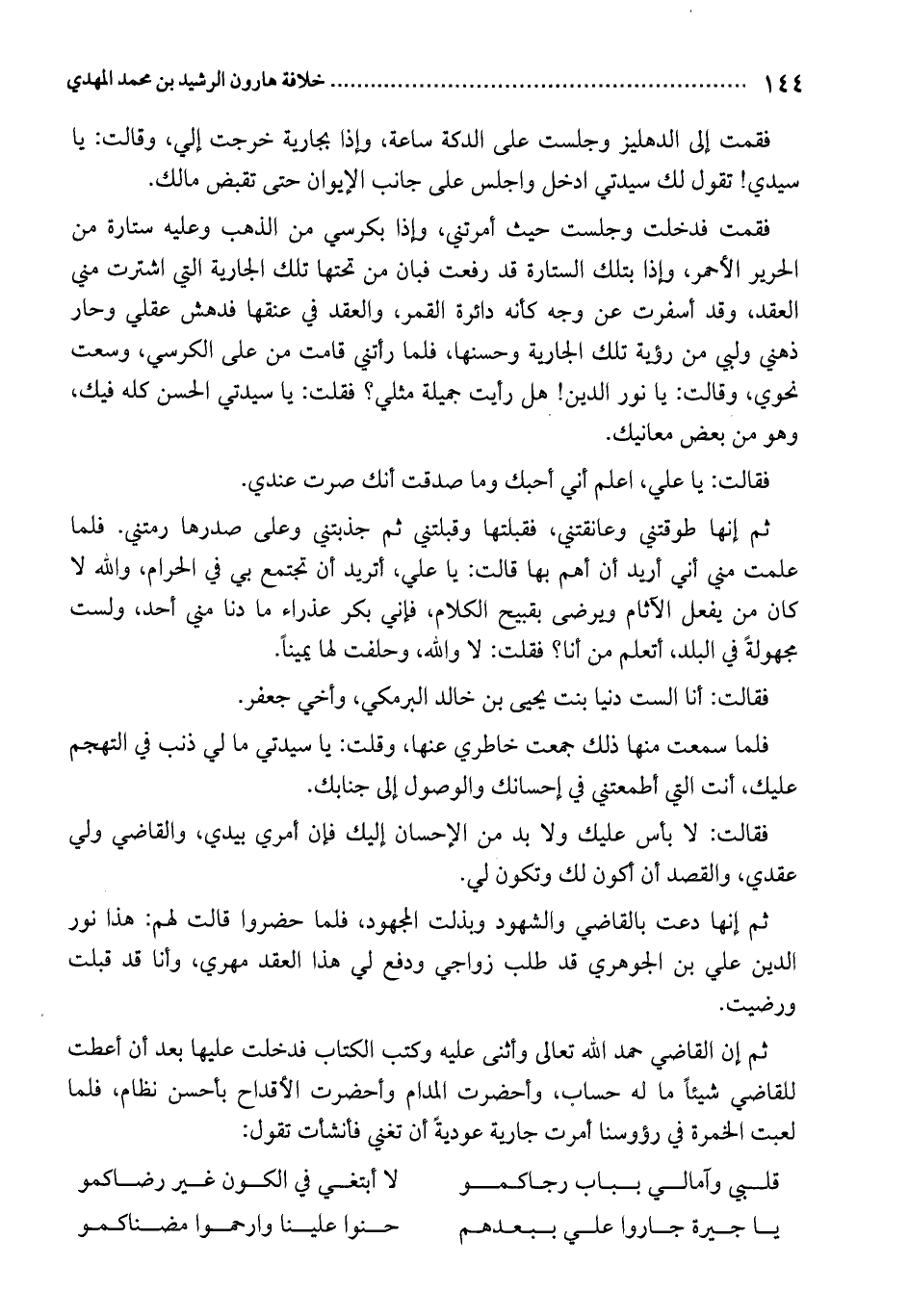 ثم إن القاضي حمد الله تعالى وأثنى عليه وكتب الكتاب فدخلت عليها بعد أن أعطت للقاضي شيئاً ما له حساب، وأحضرت المدام وأحضرت الأقداح بأحسن نظام، فلما لعبت الخمرة في رؤوسنا أمرت جارية عوديةً أن تغني فأنشأت تقول: