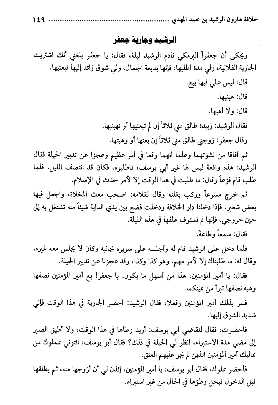 فأحضرت، فقال القاضي أبي يوسف: أريد وطأها في هذا الوقت، ولا أطيق الصبر إلى مضي مدة الاستبراء، انظر لي الحيلة في ذلك؟ فقال أبو يوسف: ائتوني بمملوك من مماليك أمير المؤمنين الذين لم يجر عليهم العتق.