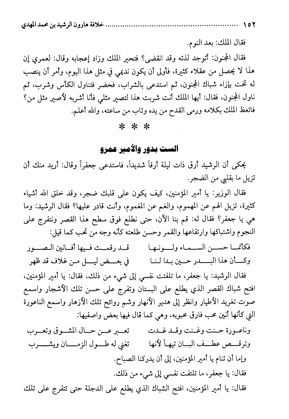 فقال الوزير: يا أمير المؤمنين، كيف يكون على قلبك ضجر، وقد خلق الله أشياء كثيرة، تزيل الهم عن المهموم، والغم عن المغموم، وأنت قادر عليها؟ فقال الرشيد: وما هي يا جعفر؟ فقال له: قم بنا الآن، حتى نطلع فوق سطح هذا القصر ونتفرج على النجوم واشتباكها وارتفاعها والقمر وحسن طلعته كأنه وجه من تحب كما قيل: