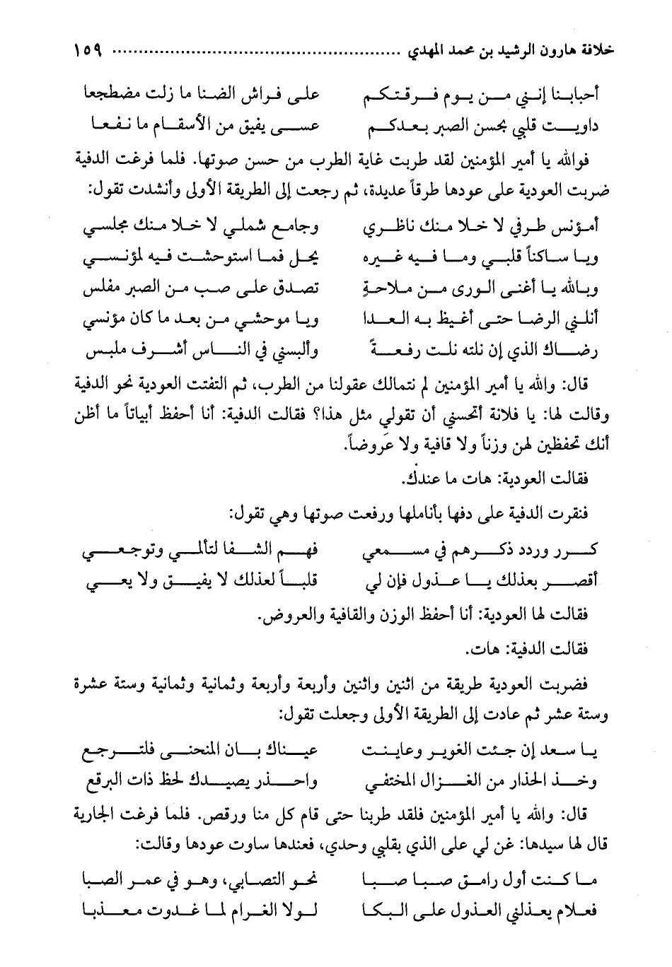 قال: والله يا أمير المؤمنين لم نتمالك عقولنا من الطرب، ثم التفتت العودية نحو الدفية وقالت لها: يا فلانة أتحسني أن تقولي مثل هذا؟ فقالت الدفية: أنا أحفظ أبياتاً ما أظن أنك تحفظين لهن وزناً ولا قافية ولا عَروضاً.
