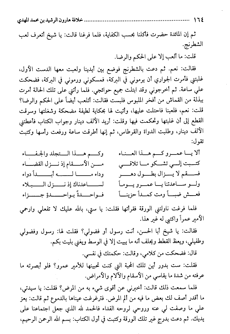 فقالت: نعم. ثم دعت بالشطرنج فوضع بين أيدينا ولعبت معها الدست الأول، غلبتني فأمرت الجواري أن يرموني في البركة، فمسكوني ورموني في البركة، فضحكت علي ساعة. ثم أخرجوني وقد ابتلت جميع حوائجي. فلما رأتني على تلك الحالة أمرت ببذلة من القماش من أفخر الملبوس فلبست فقالت: أتلعب أيضاً على الحكم والرضا؟ قلت: نعم، فلعبنا فاحتلت عليها، وأتيت لها بحكاية لطيفة مضحكة وشغلتها وسرقت القطع إلى أن غلبتها وتحكمت فيها وقلت: أريد الألف دينار وجواب الكتاب فأعطتني الألف دينار، وطلبت دواة والقرطاس، ثم إنها أطرقت ساعة ورفعت رأسها وكتبت تقول: