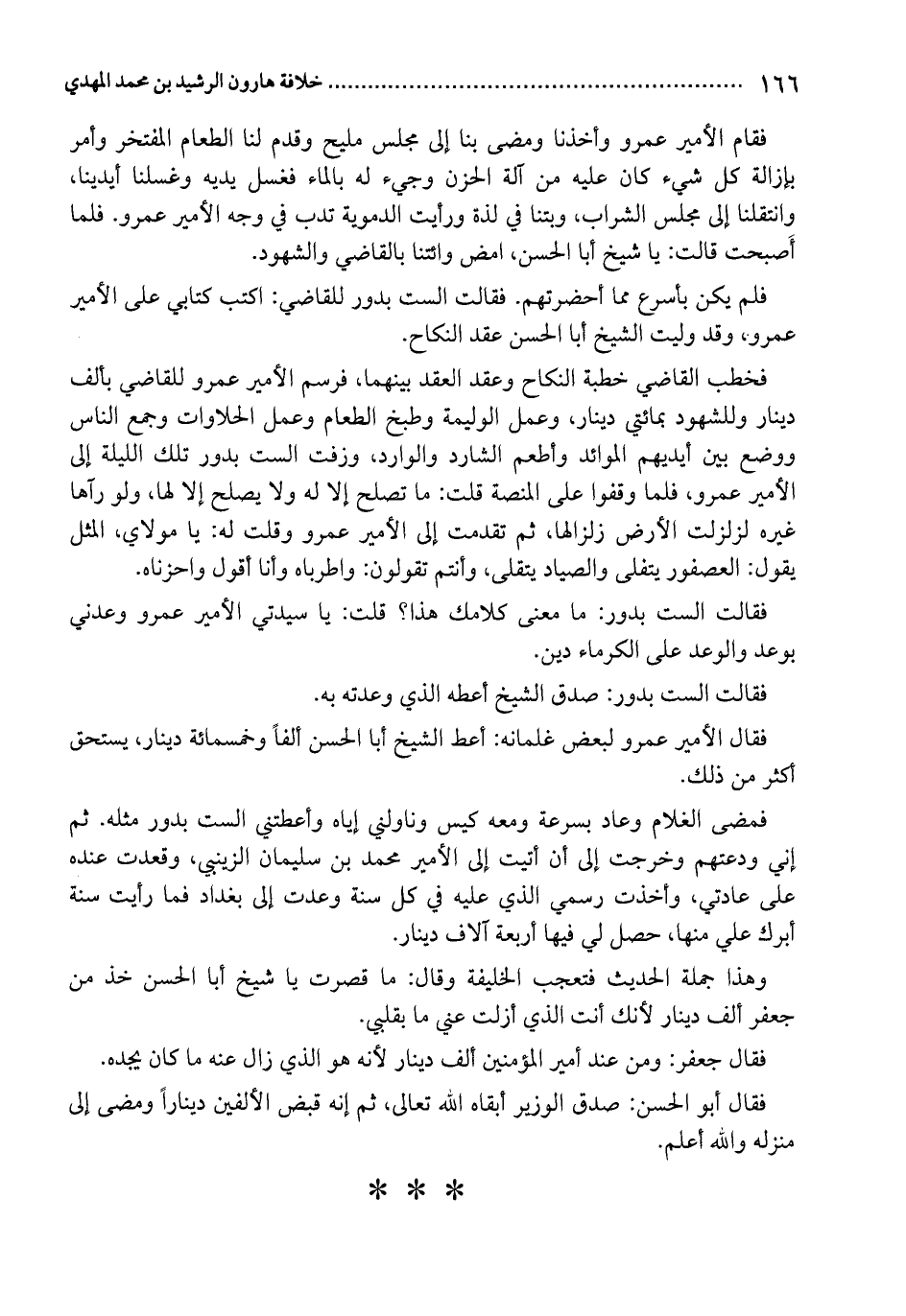 فمضى الغلام وعاد بسرعة ومعه كيس وناولني إياه وأعطتني الست بدور مثله. ثم إني ودعتهم وخرجت إلى أن أتيت إلى الأمير محمد بن سليمان الزينبي، وقعدت عنده على عادتي، وأخذت رسمي الذي عليه في كل سنة وعدت إلى بغداد فما رأيت سنة أبرك علي منها، حصل لي فيها أربعة آلاف دينار.